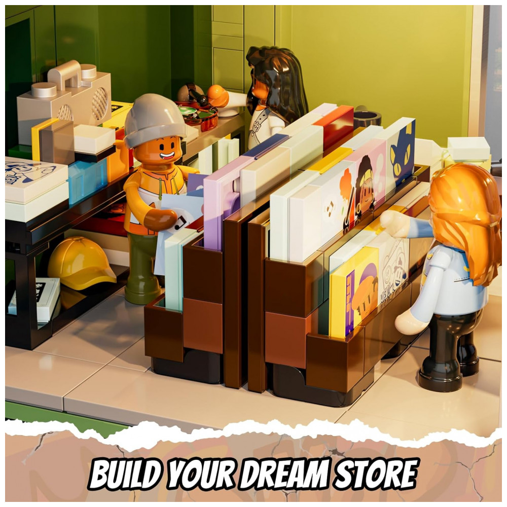 O conjunto inclui seis personagens voltados ao universo musical, como proprietário, DJ, artista, grafiteiro e frequentadores, favorecendo narrativas ligadas a loja, apresentações e gravações. Diversas peças impressas representam capas de álbuns, discos, placas e painéis gráficos, enriquecendo o ambiente de loja de música e estúdio.