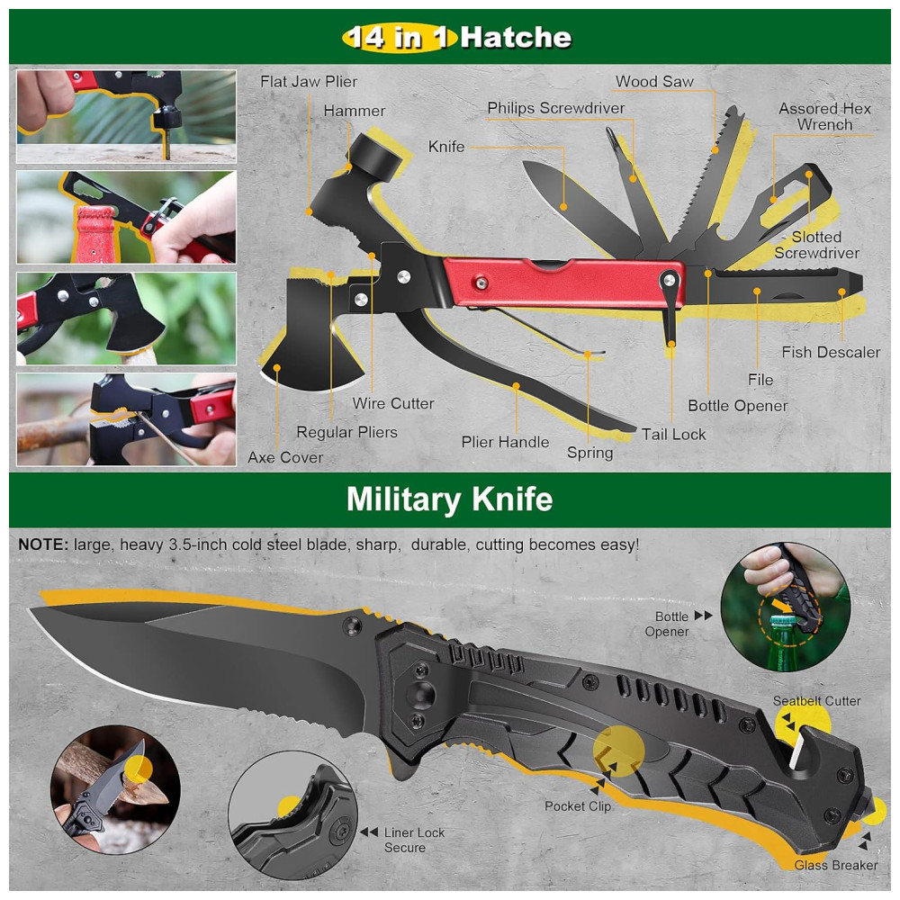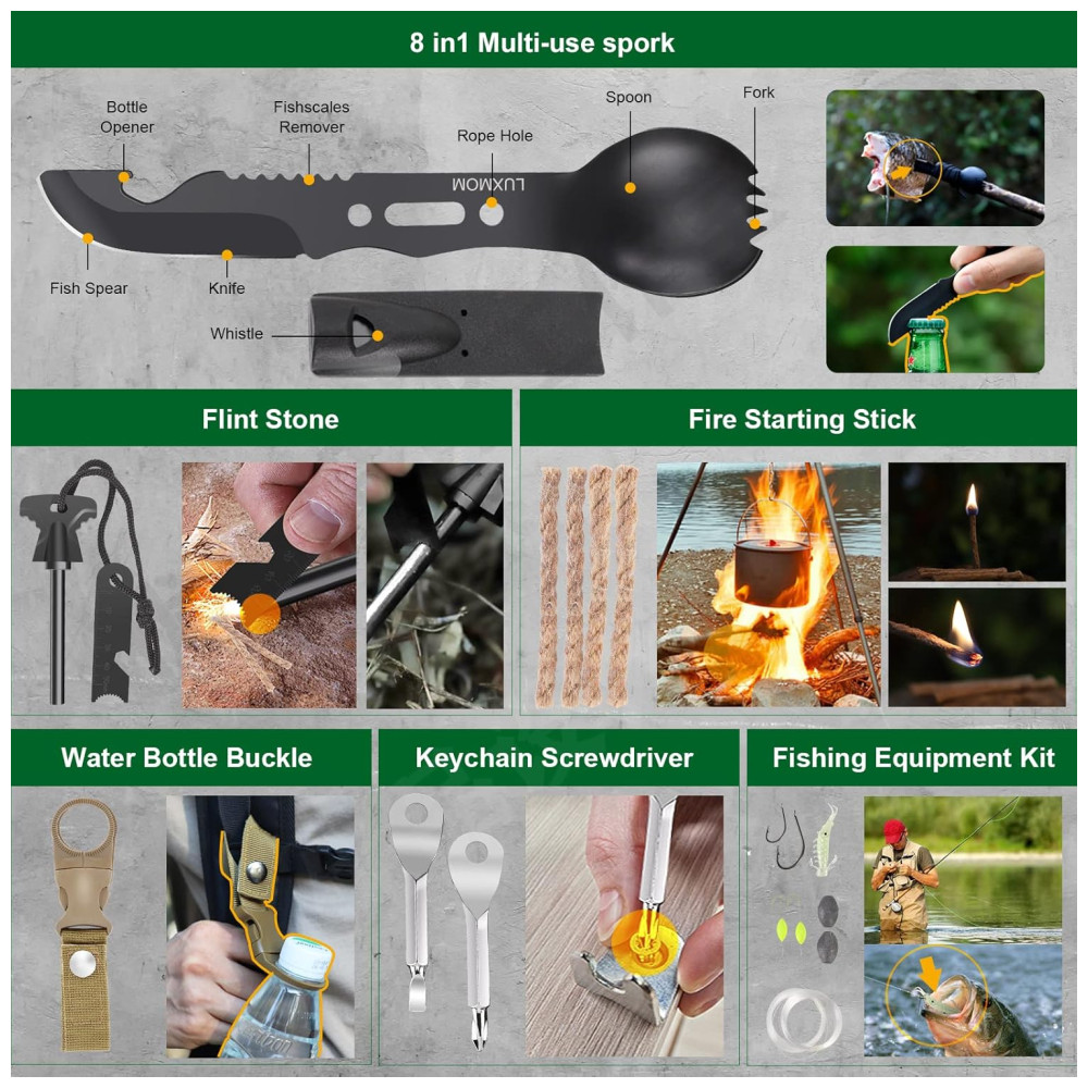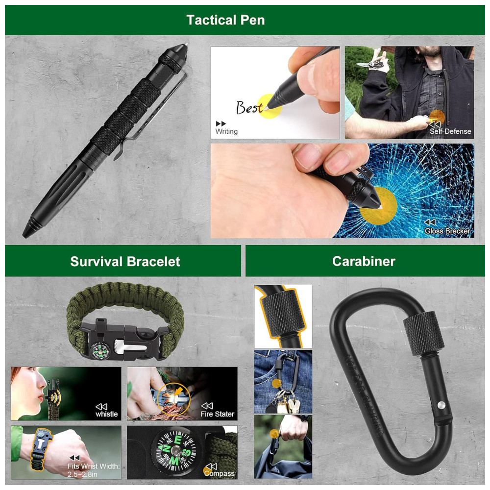 Deve ter equipamentos e equipamentos de sobrevivência Nosso kit de sobrevivência de emergência contém tudo o que você precisa quando ocorre alguma situação de emergência. 30 acessórios de acampamento populares estão no kit machado 14 em 1, caneta tática, farol de led, fole de bolso, fivela de suspensão de garrafa, faca militar dobrável, garfo multiuso 8 em 1, pulseira de sobrevivência, iniciador de fogo, bastão de fogo, ganchos de escalada, Cartão Sabre multifuncional, serra de arame, cobertor de emergência, kit de equipamento de pesca, chaves de fenda chaveiro