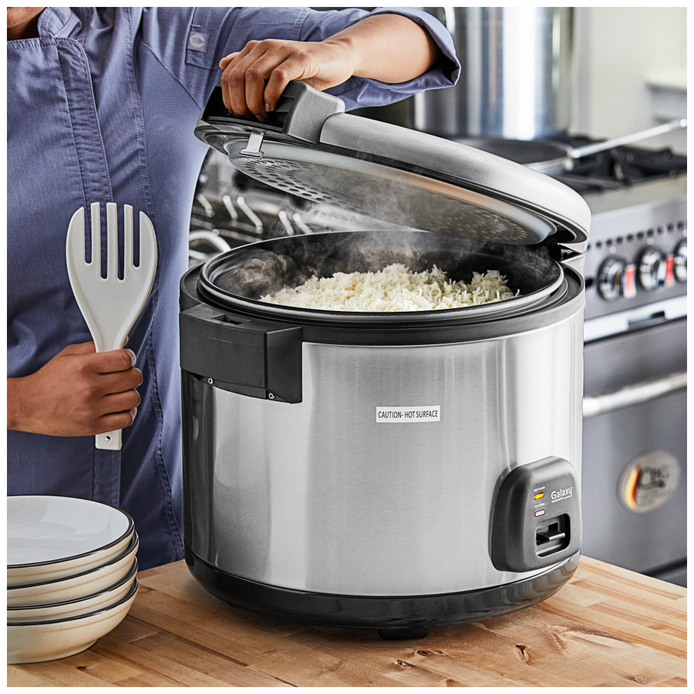 O Galaxy CFXB160-195B-1 é uma panela elétrica para cozimento e aquecimento de arroz com capacidade para 30 xícaras de arroz cru (equivalente a 60 xícaras cozidas em 40 minutos). Projetada para operações comerciais como restaurantes asiáticos, mexicanos ou balcões de sushi, possui exterior em aço inoxidável e tampa com dobradiça selada para reter umidade durante o cozimento. Inclui pote interno removível em alumínio antiaderente para facilitar a limpeza.
