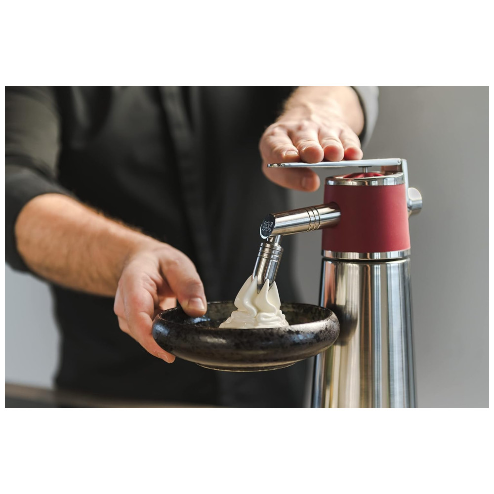 MULTI FUNCIONAL PROFISSIONAL WHIPPER: Free standing Thermo XPress é um um quart self service, chicoteador de pé livre com isolamento térmico que pode manter quantidades generosas de chantilly, sobremesas, espumas espuma, sopas, molhos ou finger foods exatamente onde eles são necessários ação de alavanca com ajuste fino melhorado para porcionamento fácil, simples e , bem como apresentação ainda mais esteticamente atraente funcional e bonito