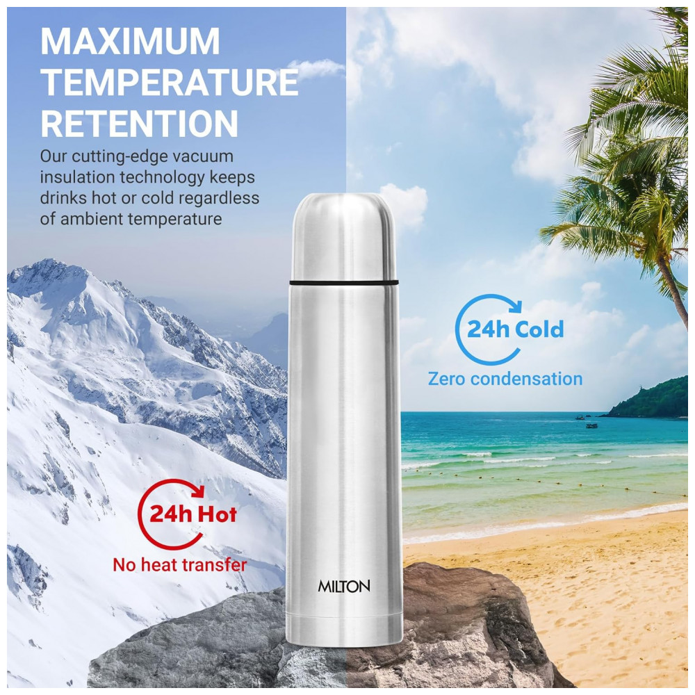Retenção de temperatura por 24 horas A garrafa de aço inoxidável Milton foi projetada com isolamento a vácuo de parede dupla e um revestimento interno de cobre. Este design exclusivo garante que suas bebidas permaneçam quentes ou frias por 24 horas completas, independentemente da temperatura ambiente. Assim, você pode desfrutar de suas bebidas favoritas na temperatura perfeita durante todo o dia.