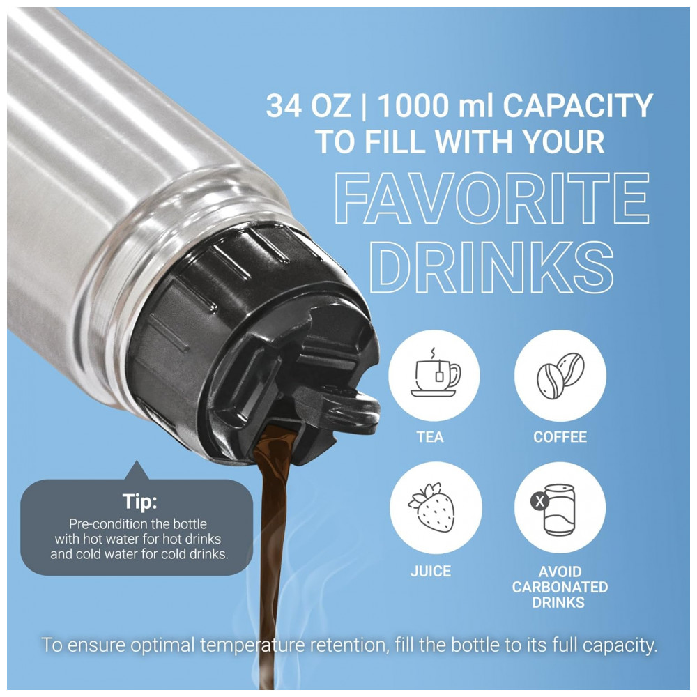 Feito para estilos de vida ativos Se você precisa de uma garrafa de ginástica ou para suas aventuras ao ar livre, a garrafa Thermosteel Flip Lid atende a quase todas as necessidades para acompanhar seus objetivos de hidratação. Adequado para encher com bebidas quentes ou frias, café, chá, suco ou água. Leve o para a academia, escritório, escola ou qualquer lugar