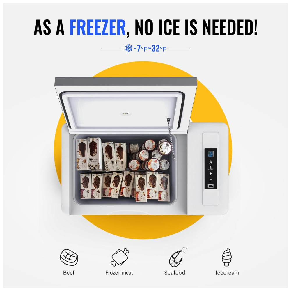 45dB de baixo ruído O freezer do caminhão foi projetado para baixo nível de ruído para garantir um boa noite de sono após uma longa direção. Este refrigerador de camping também tem um design à prova de choque para enfrentar as estradas irregulares, operando sem problemas no caso de uma inclinação de 30 quando você estiver fora da estrada.