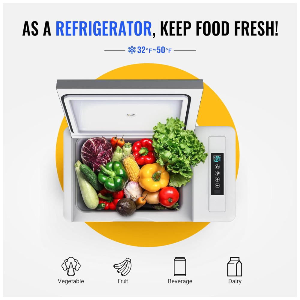 Resfriamento rápido até 0 C Com a tecnologia de refrigeração do compressor, este freezer de 12 V pode atingir 20 min de resfriamento rápido de 25 C a 0 C e 50 min de 25 C A 20 C, mantendo seus alimentos frescos. Sem gelo necessário, sem comida estragada, dinheiro e economia de espaço. 55 x 30 x ., Peso9 kg