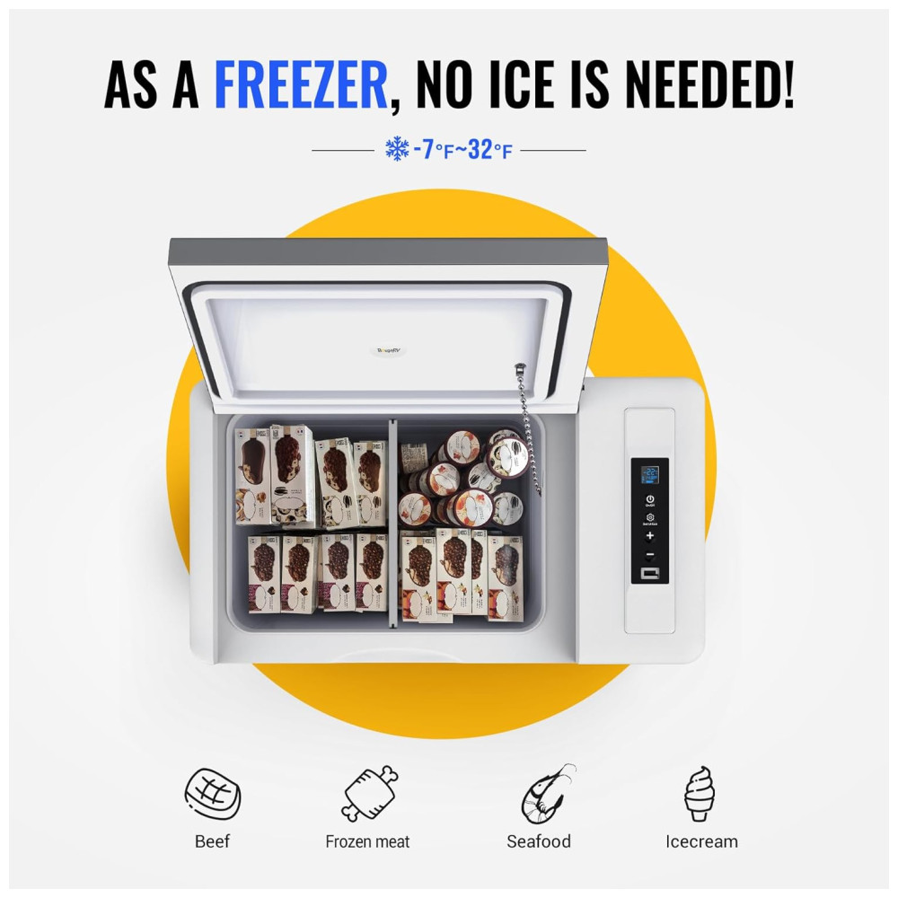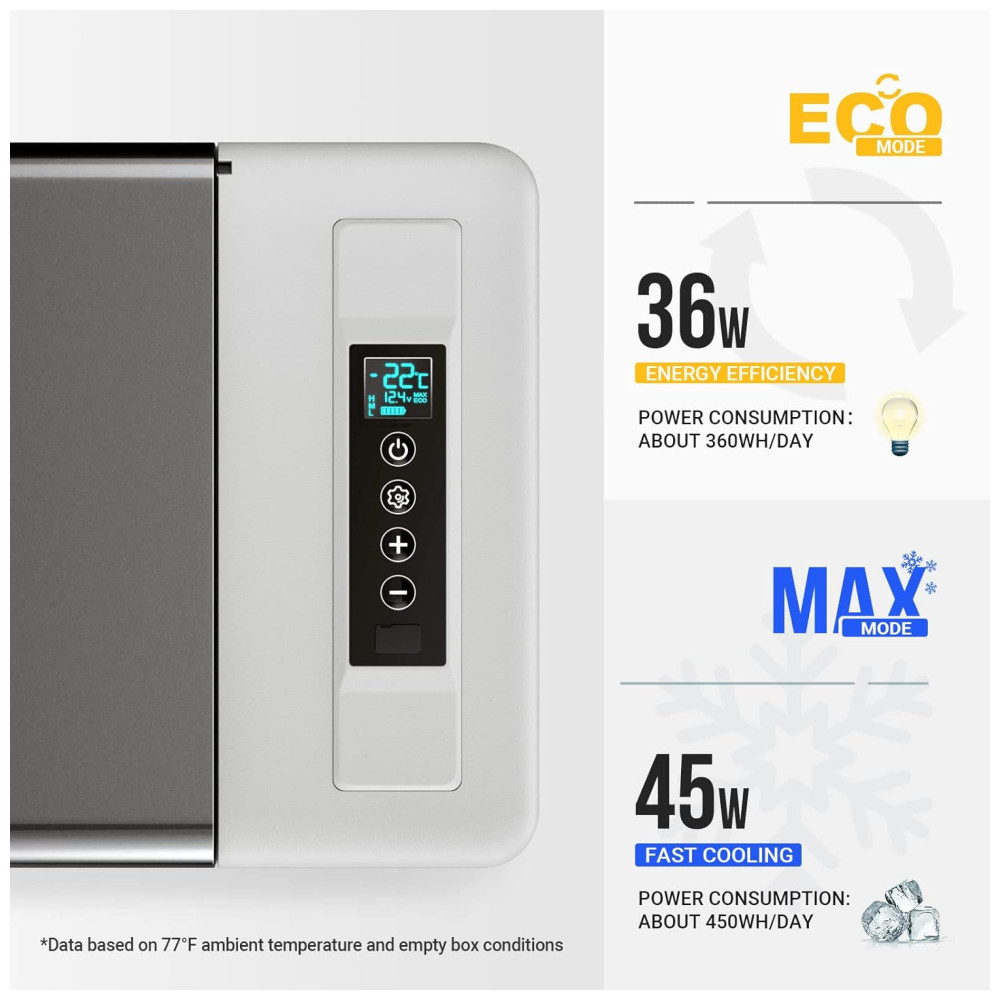 Baixo consumo de energia de 36 W: Com o modo de economia de energia ECO, a potência operacional deste refrigerador portátil de 30 L é inferior a 36 W. Mesmo funcionando no modo MAX, consome muito menos de 1 kWh, dia para seu ciclo inteligente de trabalho. Você pode operar este refrigerador portátil com alimentação de 12, 24 V DC em vários veículos, como SUVs, caminhões, trailers, trailers, vans, barcos, etc.