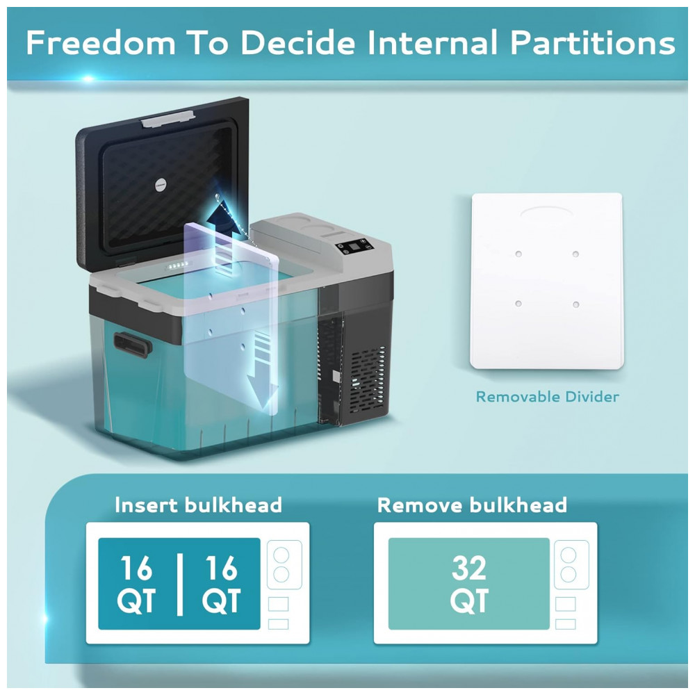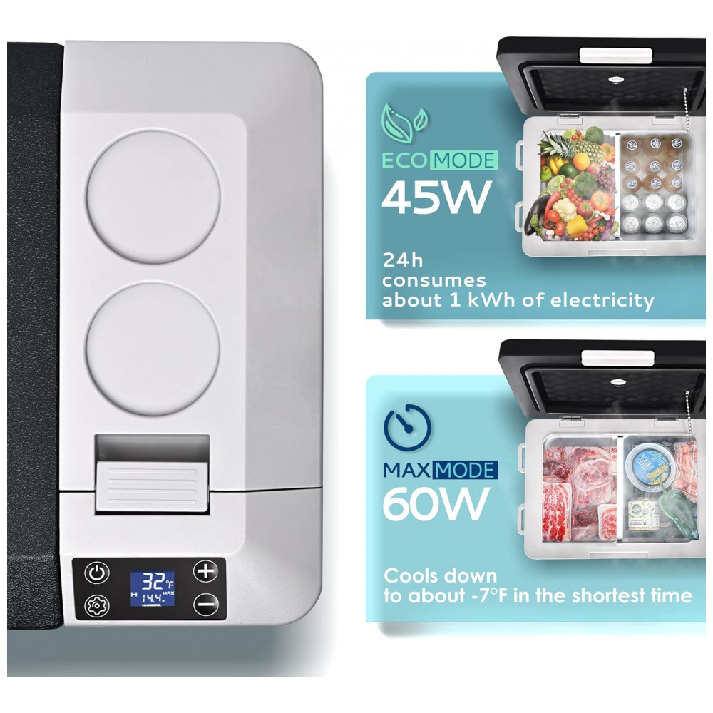 Resfriamento e modo duplo: O refrigerador de carro adota tecnologia de refrigeração por compressor, este refrigerador portátil pode atingir resfriamento rápido de 10 a 0 em 15 minutos o frigorífico do carro também inclui uma divisória amovível para separar as duas zonas, com modo de poupança de energia ECO, este frigorífico rv só funciona a 45W. Mesmo no modo MAX, o consumo do seu funcionamento em loop inteligente é de apenas cerca de 1 kWh, dia.