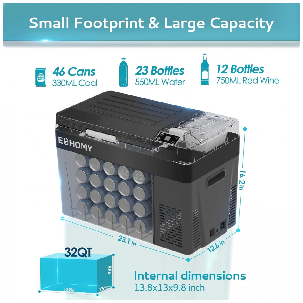Parâmetros e recursos: Espaço de zenamento: 35,1 x 33 x 24,9 centímetros, capacidade 32 litros, adequado para 42 latas de cola de 330 ml. O refrigerador portátil está equipado com dois ganchos de um lado, permitindo que você use uma corda para prender o plugue no refrigerador para o assento ou outra superfície lisa dentro do carro, para que você não precise mais se preocupar com o deslizamento acidental da geladeira durante a condução. Duas alças côncavas também são projetadas em ambos os lados do refrigerador de 12v, o que economiza muito esforço quando você o move.