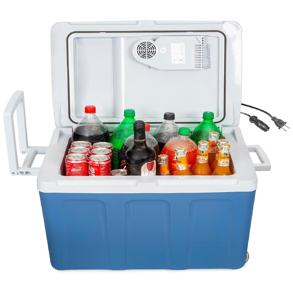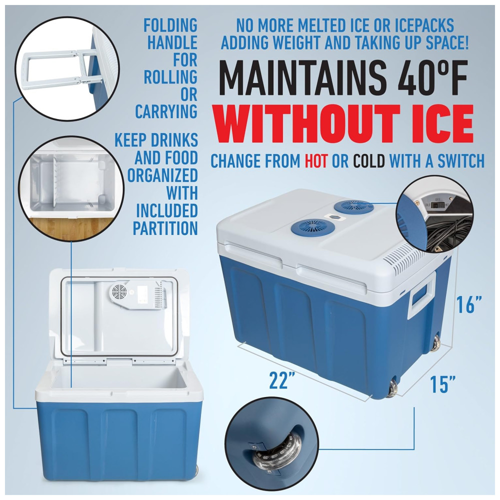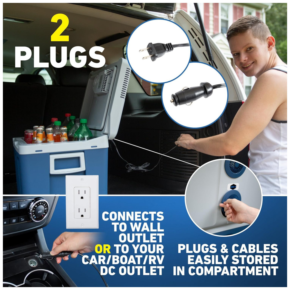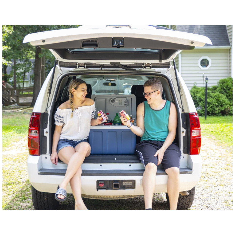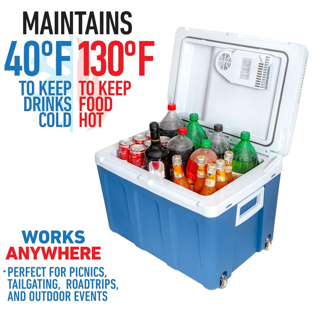 REFRIGERADOR E AQUECEDOR DE VIAGEM PORTÁTIL Esteja você viajando na estrada ou acampando em um trailer, trailer ou minivan, este contêiner de zenamento de grande capacidade para aquecer e aquecer ou resfriar e resfriar alimentos e bebidas.