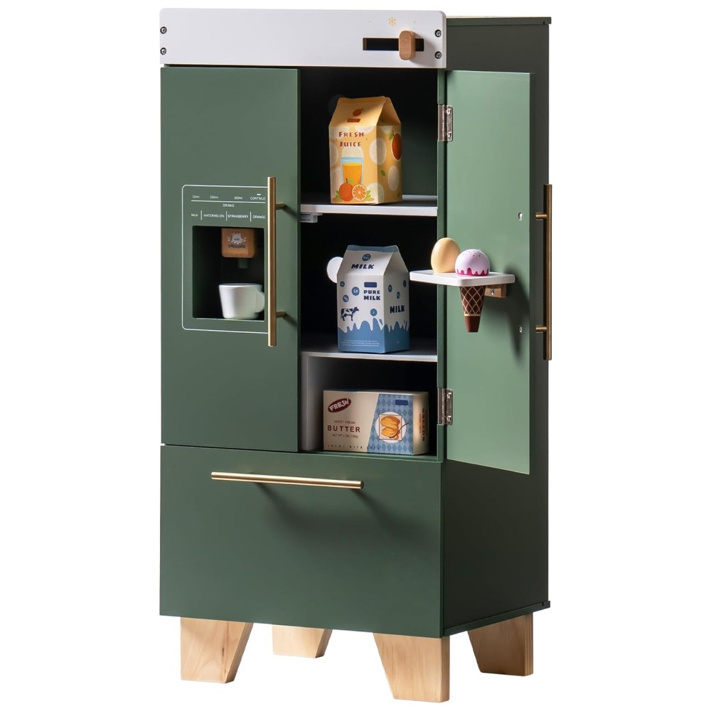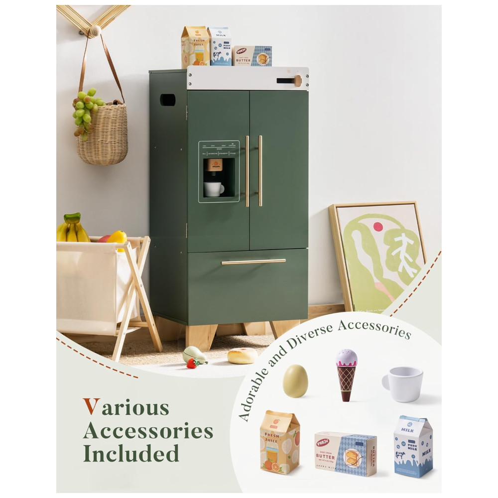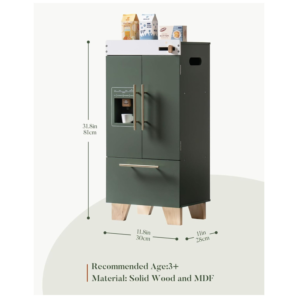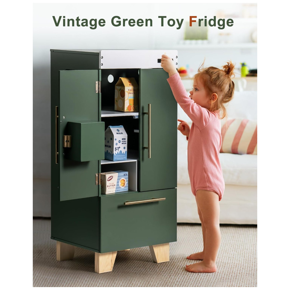 Geladeira Educativa de Brinquedo Geladeira de Madeira ROBUD com Acessórios Geladeira Interativa de Brinquedo para Crianças em Verde Vintage