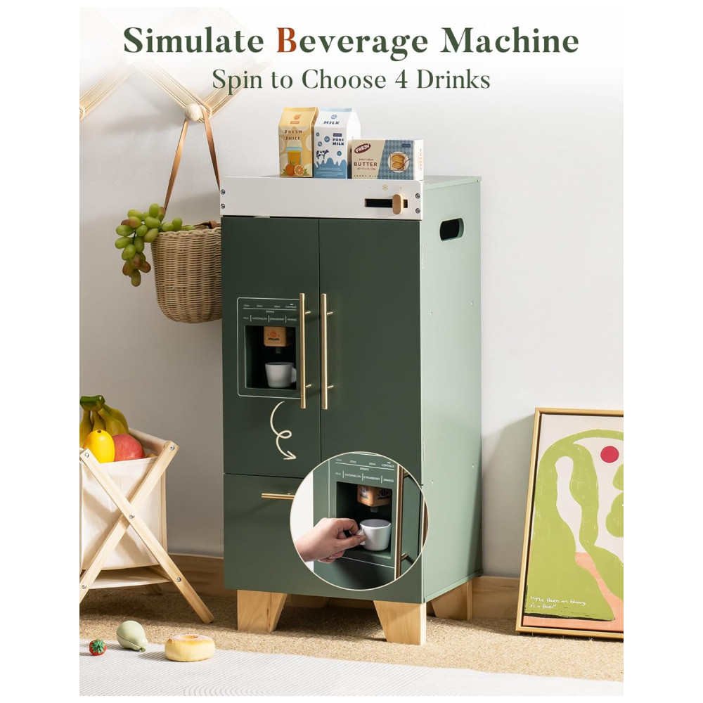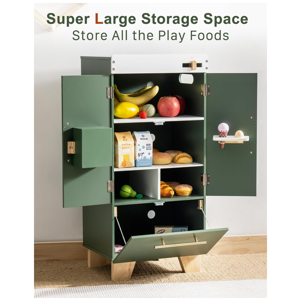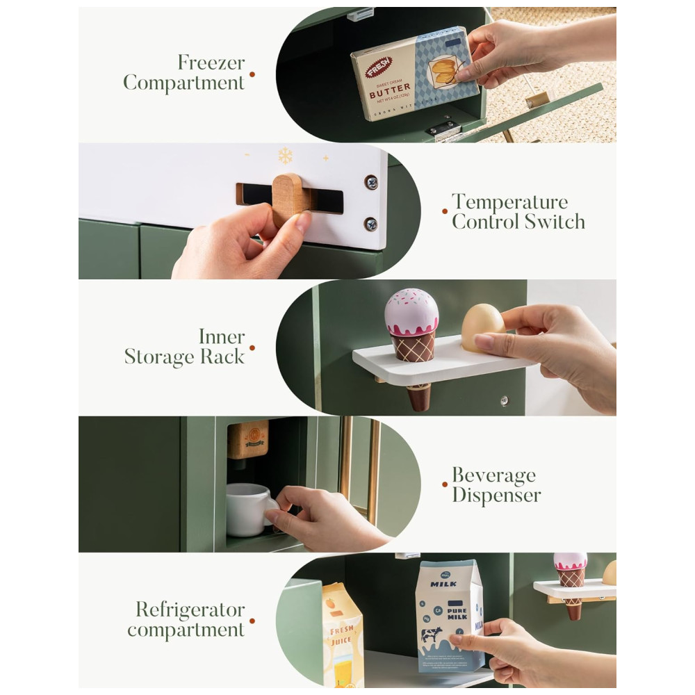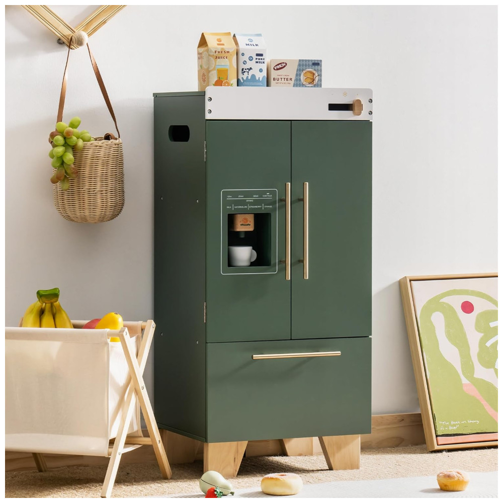 Geladeira Educativa de Brinquedo Geladeira de Madeira ROBUD com Acessórios Geladeira Interativa de Brinquedo para Crianças em Verde Vintage