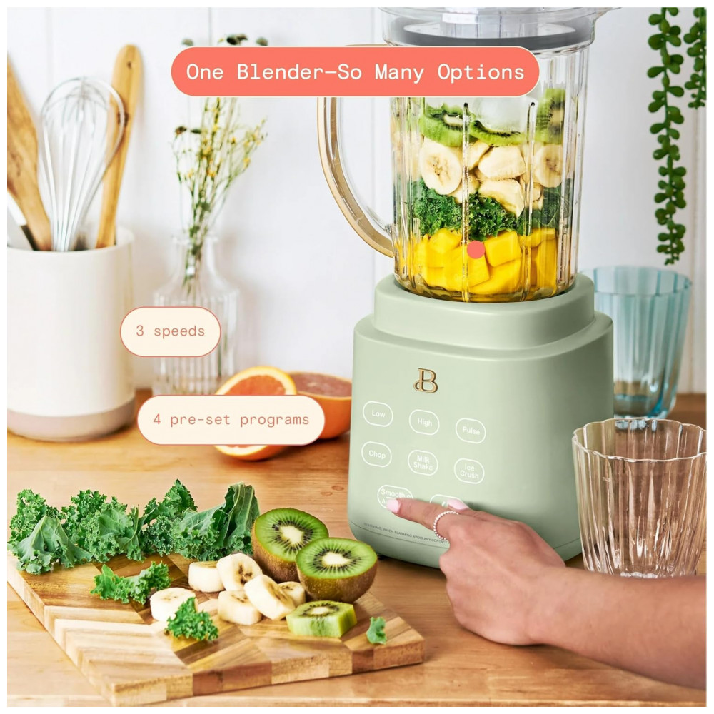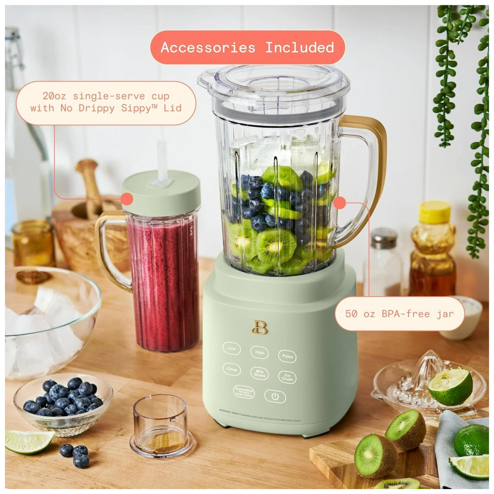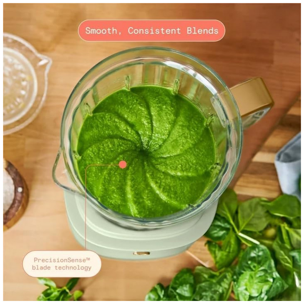 O Liquidificador PowerExact Beautiful possui motor de 700W que processa ingredientes resistentes como gelo e vegetais congelados com eficiência. A tecnologia PrecisionSense ajusta automaticamente velocidade e potência conforme o tipo de ingrediente para resultados consistentes em misturas de smoothies, salsas e sopas. Equipado com jarra de Tritan livre de BPA de 1,5L e copo individual de 590mL com tampa No Drippy Sippy patenteada, oferece versatilidade para preparos em bancada ou portáteis.