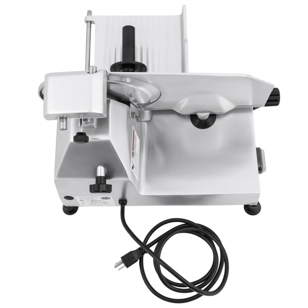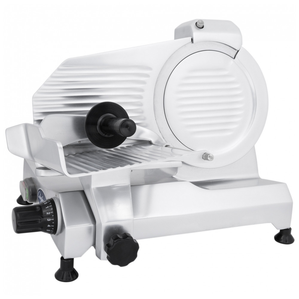 Construída em alumínio anodizado, a Globe Chefmate C9 é uma fatiadora compacta ideal para operações pequenas, como cafeterias, que precisam fatiar ocasionalmente e possuem espaço limitado no balcão. Com motor de 1/4 hp acionado por correia e lâmina de 9 polegadas, ela pode fatiar cerca de 30 minutos de carne e vegetais por dia. O design compacto economiza espaço no balcão e acomoda produtos de até 18,5 x 16 x 16,5 cm. Com controle preciso de espessura e lâmina de 25,4 cm afiada, corta facilmente produtos protegida por anel de faca para segurança dos usuários. Inclui amolador removível e fácil de limpar para manter a lâmina afiada.