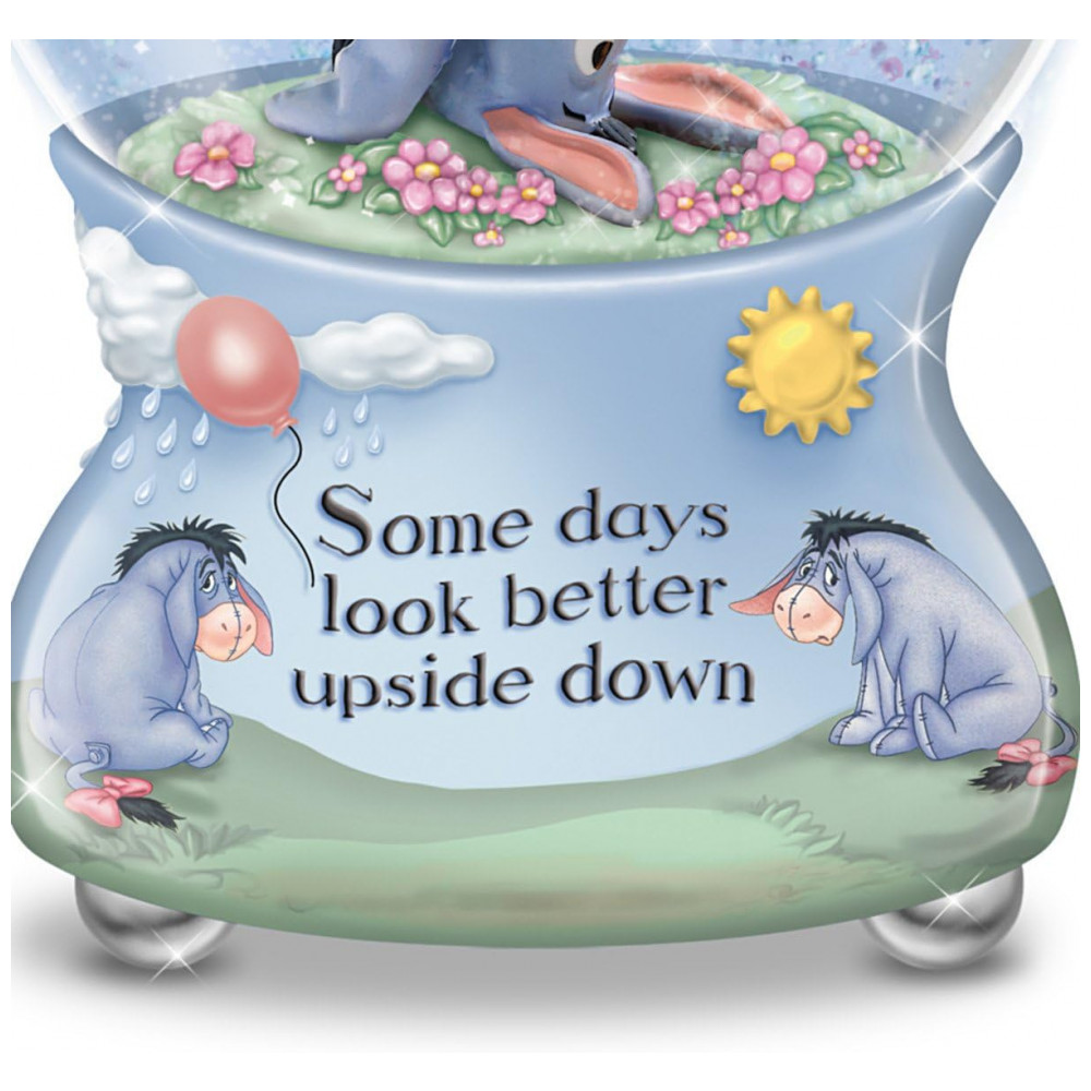 Deixe o adorável Eeyore alegrar seus dias com o globo de neve musical Disney Some Days Look Better Upside Down, da The Bradford Exchange. Este globo encanta com Eeyore posicionado de cabeça para baixo em um prado florido dentro de um globo de vidro cristalino repleto de glitter cintilante. A base metálica colorida traz imagens de Eeyore e relevos pintados à mão que complementam a mensagem inspiradora “Some days look better upside down”. Ao sacudir, o glitter dança formando um espetáculo brilhante, acompanhado pela música suave “Raindrops Keep Falling On My Head”. Uma edição limitada com design artesanal que traz alegria e otimismo para fãs e colecionadores Disney.