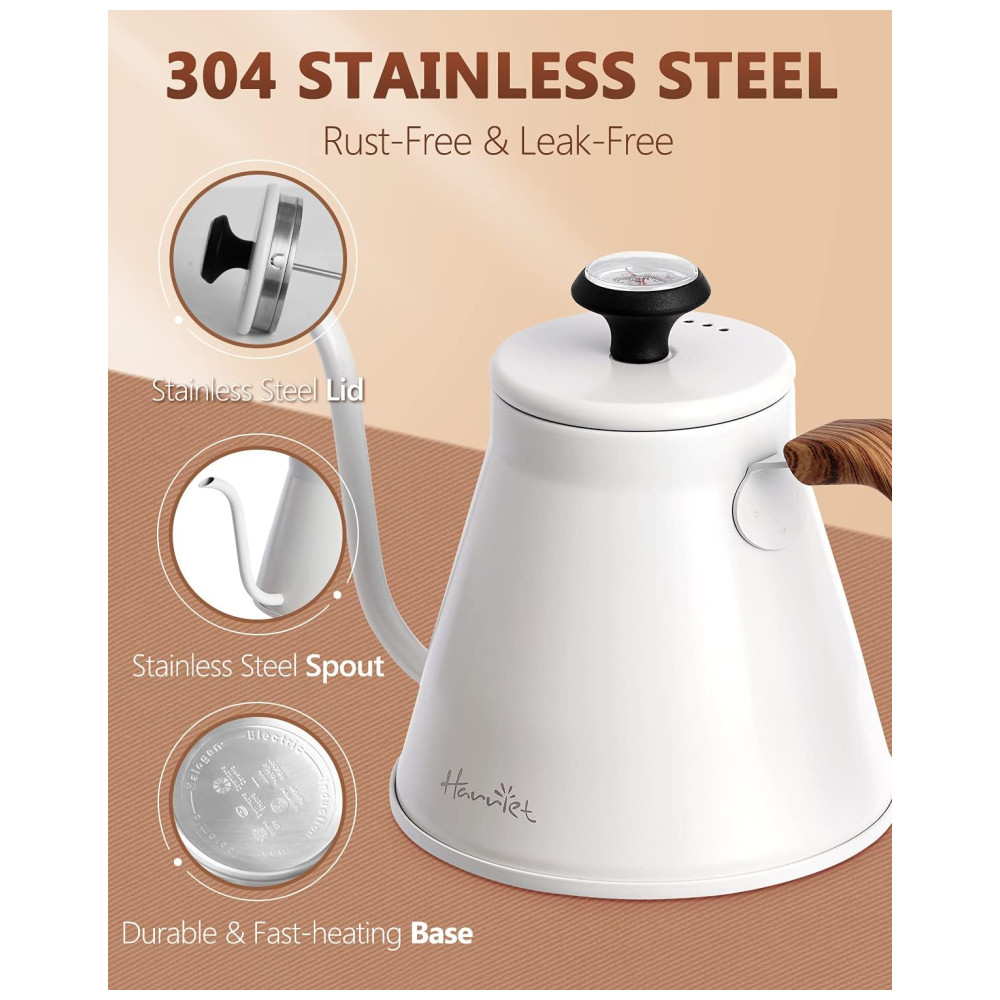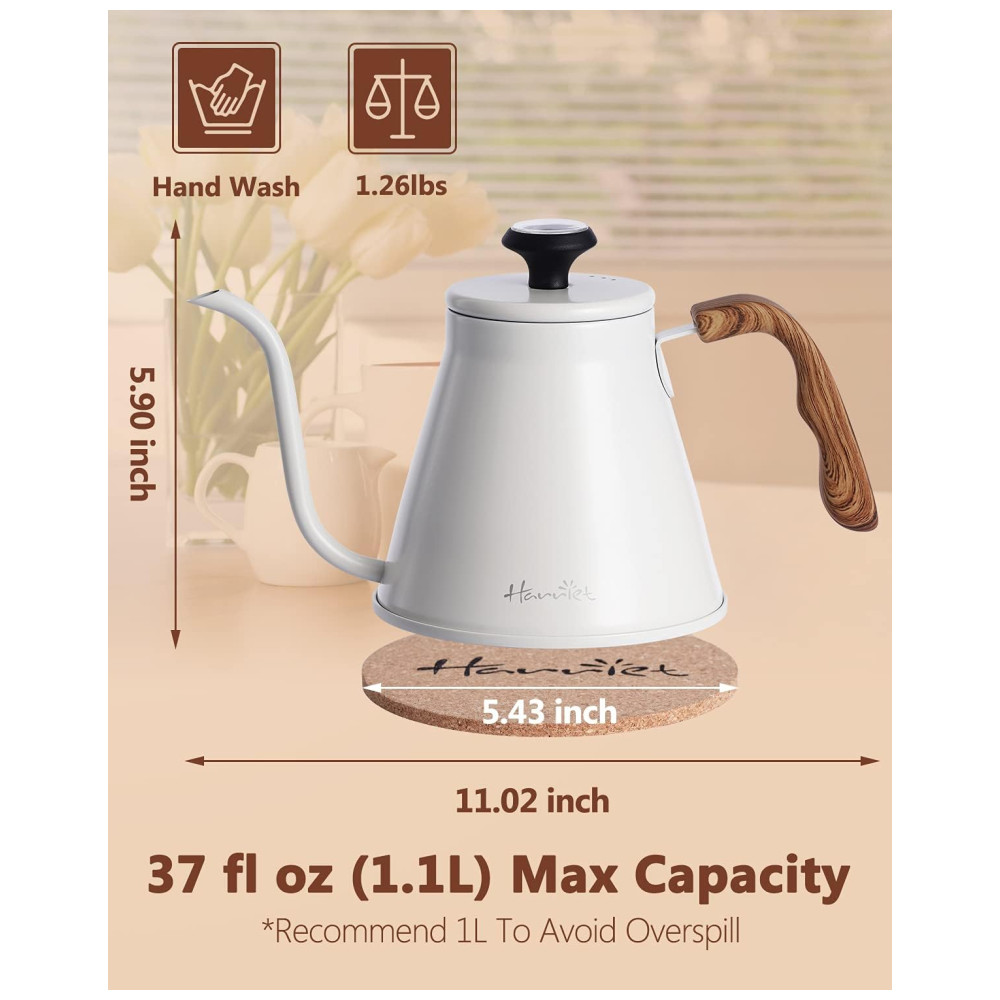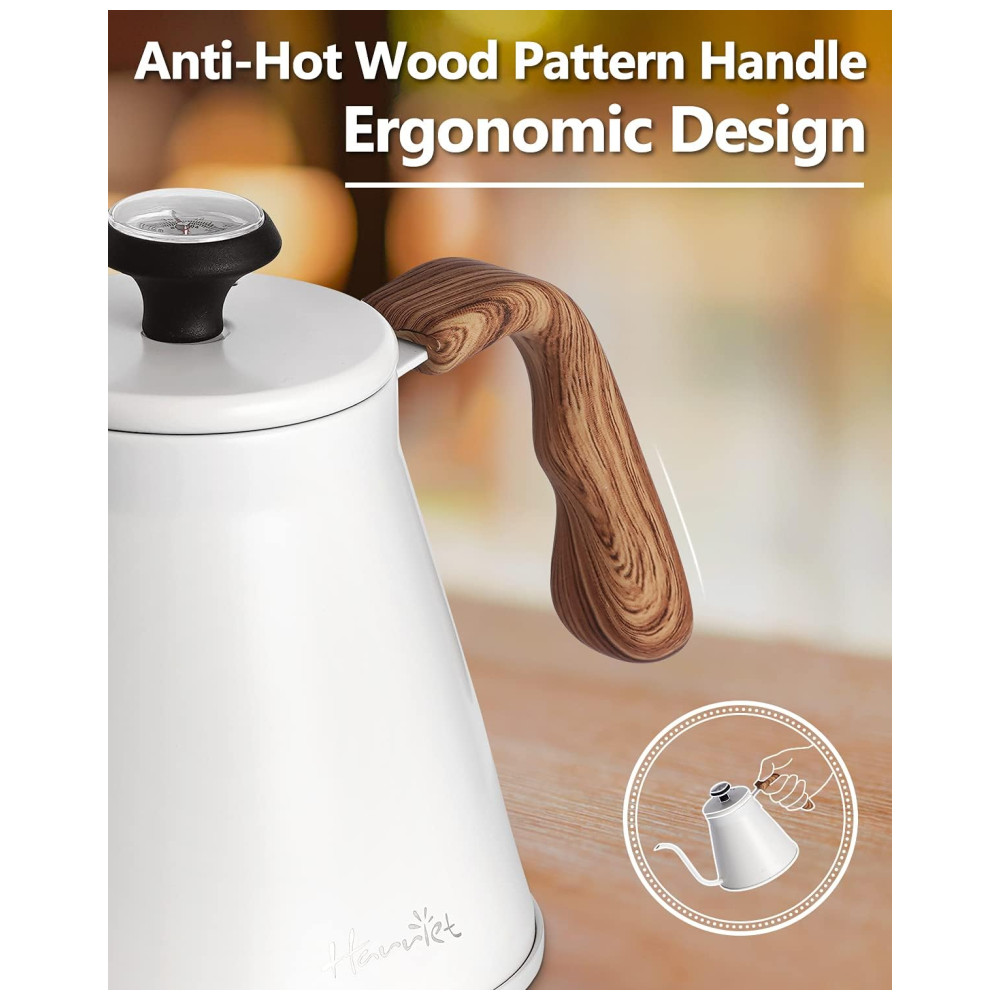 PUNHO DE RESINA ANTI QUENTE RESISTENTE E ERGONÔMICO Este design estético e ergonômico da chaleira adota alça de resina resistente ao calor e um tapete de isolamento térmico adicional, permite que você segure a chaleira de café com as mãos sem risco de queimaduras. A forma ergonômica torna você mais confortável ao levantar, despejar e encher a água, garantindo que a cafeteira não escorregue. O design exclusivo de padrão de madeira da alça decora sua cozinha.