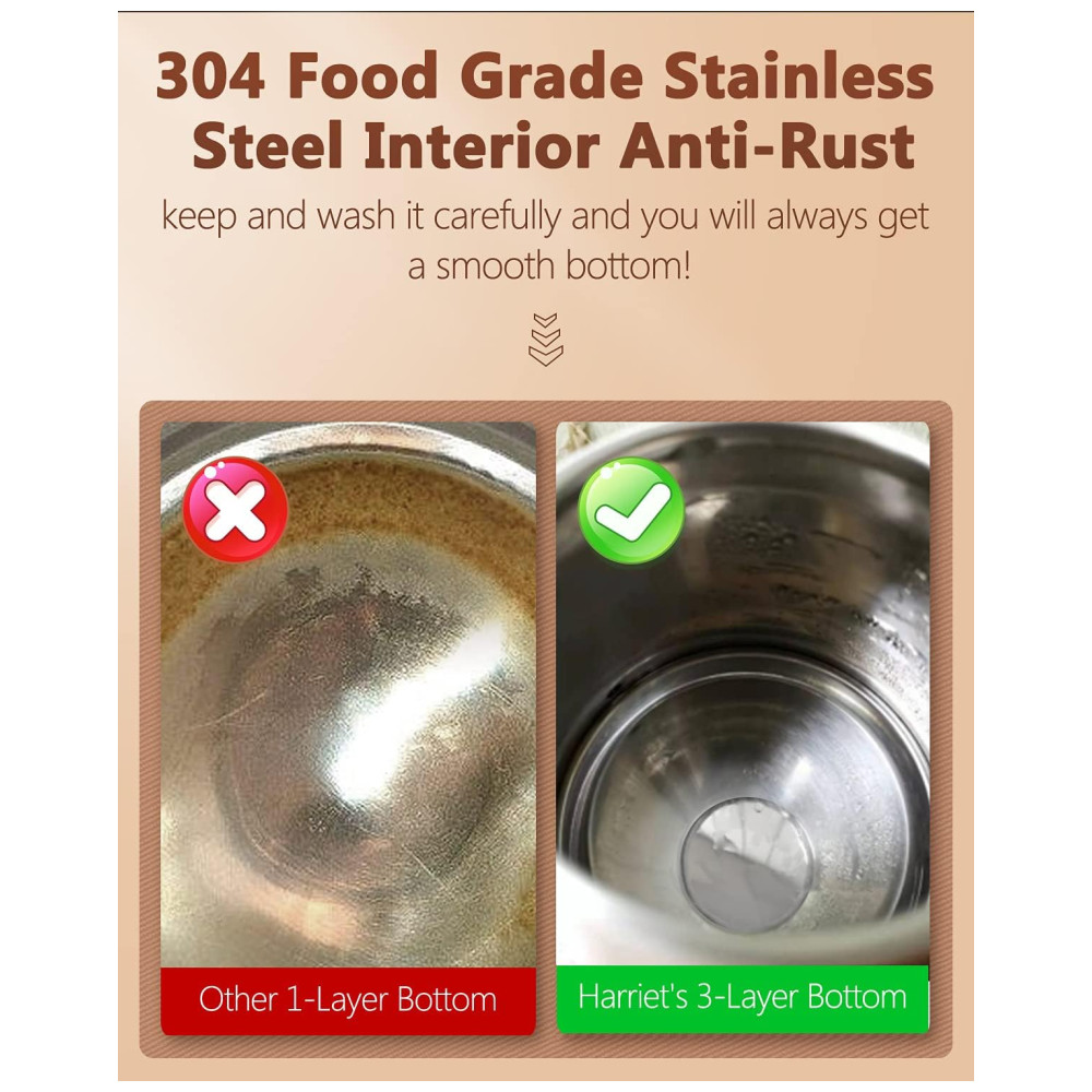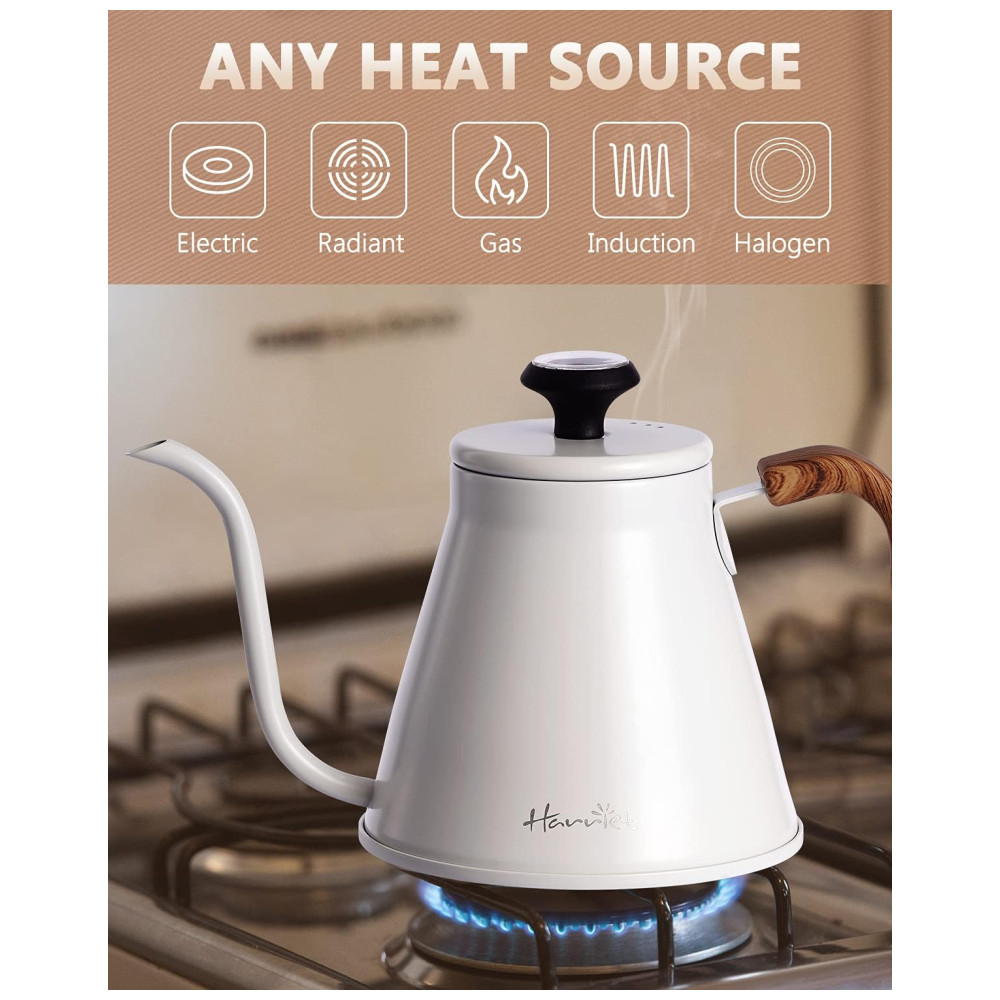 DESIGN ÚNICO DE BASE DE TRÊS CAMADAS Em comparação com outras chaleiras de café que têm apenas uma ou duas camadas de metal na parte inferior, nossa chaleira tem um design exclusivo de base de três camadas para manter sua chaleira livre de vazamentos e sem ferrugem por anos , que pode fornecer circulação de calor uniforme e ebulição rápida, que preserva mais o calor do que um pote de base de camada única.