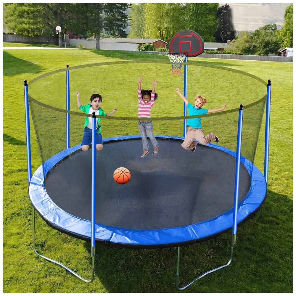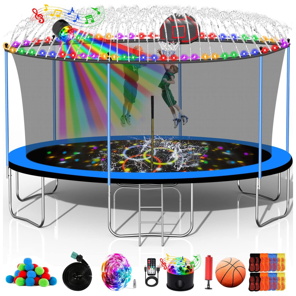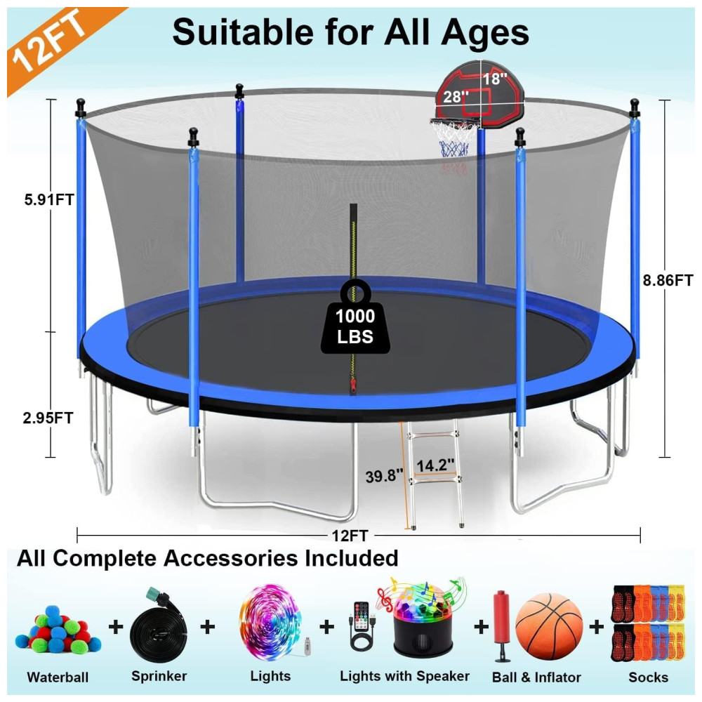 Goujxcy 12FT 14FT 15FT 16FT Trampolim para crianças e adultos 1500 LBS trampolins ao ar livre com cesta de basquete luzes sprinkler gabinete escada salto recreativo no quintal para crianças adolescentes 12 pés azul com luzes alto falante sprinkler