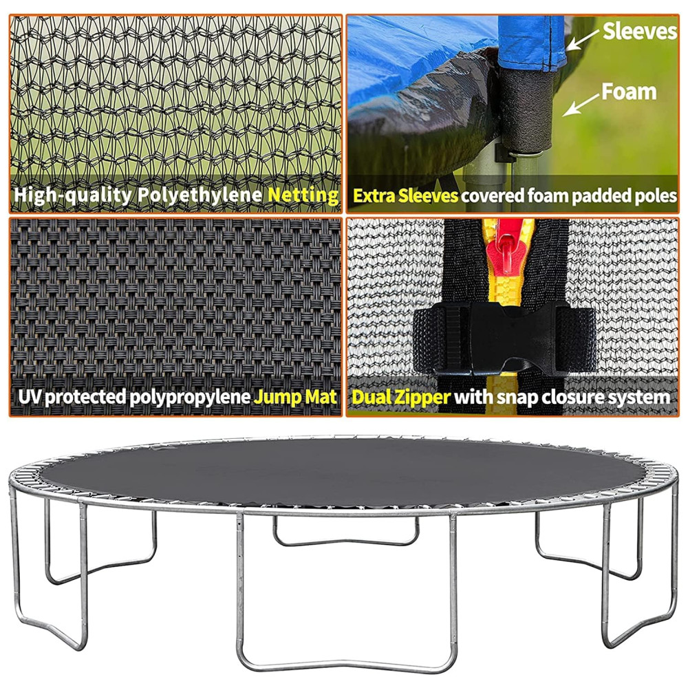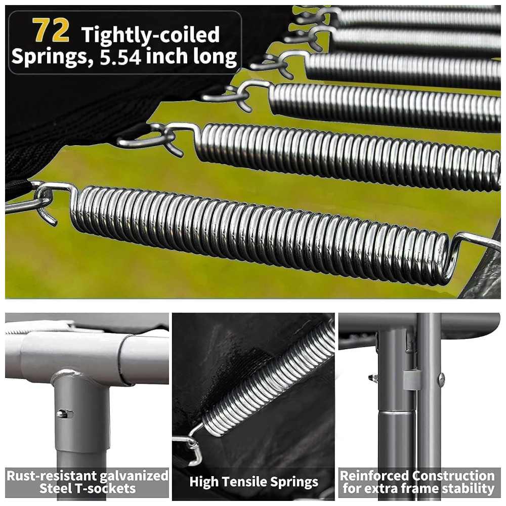 Salte para se divertir e se exercitar Saltar é uma ótima maneira de queimar calorias enquanto se diverte muito. Pode melhorar a força, densidade óssea, agilidade, equilíbrio e coordenação do seu filho. Com o trampolim grande, seus filhos também podem ficar longe dos eletrônicos. Trampolim resistente para crianças e adultos A estrutura utiliza aço reforçado com uma junta em T, tornando o trampolim grande uma base sólida e rígida e um salto mais suave e impressionante e uma carga pesada para crianças e adultos. A estrutura resistente à ferrugem oferece uso a longo prazo. A rede é forte e de boa qualidade. Uso interno e externo Além do exterior, este grande trampolim para crianças também pode ser em ambientes internos, mesmo que esteja chovendo, seus filhos também podem se divertir dentro de casa. A cesta de basquete recreativa adiciona muita diversão para seus filhos. Especificações Peso máximo de carga do trampolim de 16 pés 1.500 libras, para 8 a 10 crianças, limite de uma única pessoa 264 libras Peso máximo de carga do trampolim de 15 pés 1.400 libras, para 7 a 9 crianças, limite de uma única pessoa 264 libras Peso máximo de carga do trampolim de 14 pés 1.200 libras, para 6 8 crianças, limite de pessoa ÚNICA 264 libras Trampolim de 12 pés Peso máximo de carga 1000 libras, para 4 6 crianças, limite de pessoa ÚNICA 264 libras Altura do trampolim 8,86 pés Altura da rede do gabinete 5,9 pés Altura da perna 2,95 pés Construção da estrutura Tapete de salto de aço galvanizado resistente à ferrugem com proteção UV Rede de segurança de polipropileno Almofada de mola de polipropileno Molas resistentes a UV Resistente às intempéries Aço galvanizado Certificação ASTM F381 F2225 Aprovado Fácil montagem necessária Sim Informações do pacote O trampolim 16FT 15FT 14 FT virá em 2 caixas de embalagem. O trampolim de 12 pés virá em 1 caixa de embalagem. PS a luz dos acessórios do trampolim com alto falante e outros acessórios NÃO foram colocados na caixa do trampolim. Eles serão enviados separadamente e entregues em sua caixa de correio. Você receberá um pacote pequeno também. Grande capacidade de peso A carga máxima deste trampolim de 12 é de 1.000 libras, pode acomodar de 4 a 6 crianças. Este enorme trampolim para crianças e adultos oferece uma maneira segura e eficaz de se divertir em família enquanto queima calorias e melhora a coordenação geral. Lembre se de que o peso do usuário único não excede 264 LBS, para evitar lesões causadas por força irregular no trampolim Aprovado pela ASTM Trampolim ASTM F381 F2225 Aprovado. Os postes de aço são acolchoados com espuma e mangas, o que pode proteger seus filhos de baterem no poste. O sistema de gabinete possui rede de segurança, acolchoamento protetor para cobrir a mola, ajuda a estabilizar as crianças enquanto elas pulam no trampolim infantil Estrutura de estrutura forte A construção robusta é com juntas em T de aço resistentes à ferrugem, postes de aço verticais, molas aprimoradas de 72 unidades e 6 U pernas fortes em formato, aumentando a estabilidade da estrutura e evitando torções estruturais, mantenha este trampolim de 12 pés com gabinete firmemente plantado no chão enquanto você salta para uma boa saúde Todos os acessórios completos Trampolim Goujxcy de 12 pés A prepara os acessórios que você precisa 1x inflador de bola de borracha, 1x inflador de basquete, 1x escada de trampolim, 1x luzes de trampolim, 1x luzes de discoteca com alto falante, 1x sprinkler de trampolim, 30x bolas de água reutilizáveis, 8x meias 4 pares de meias de trampolim para adultos e 4 pares de meias de trampolim para crianças Fácil de montar Você receberá o trampolim inteiro de uma só vez 1 caixa de pacote. Enquanto o sprinkler de acessórios de trampolim, cordas leves, luz de discoteca com alto falante musical, bola dágua, meias, etc. virão separadamente e em uma pequena caixa. Qualquer problema, não hesite em contactar nos