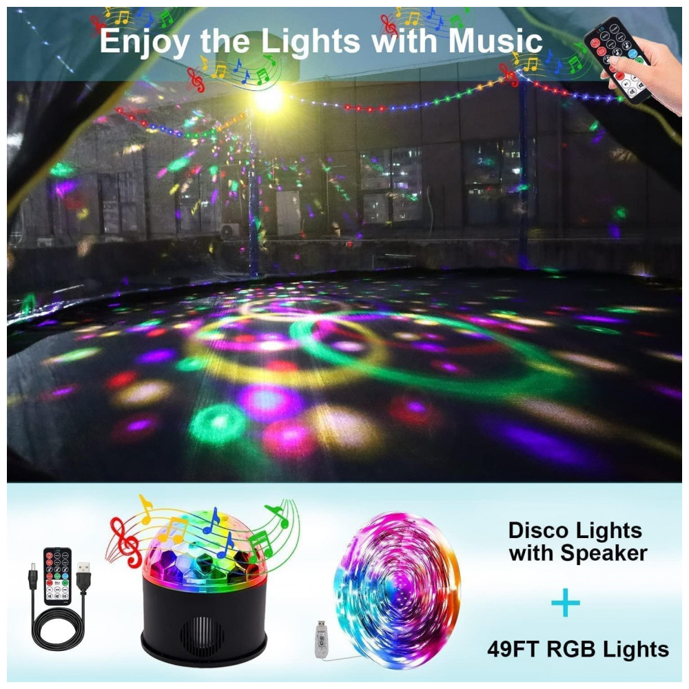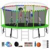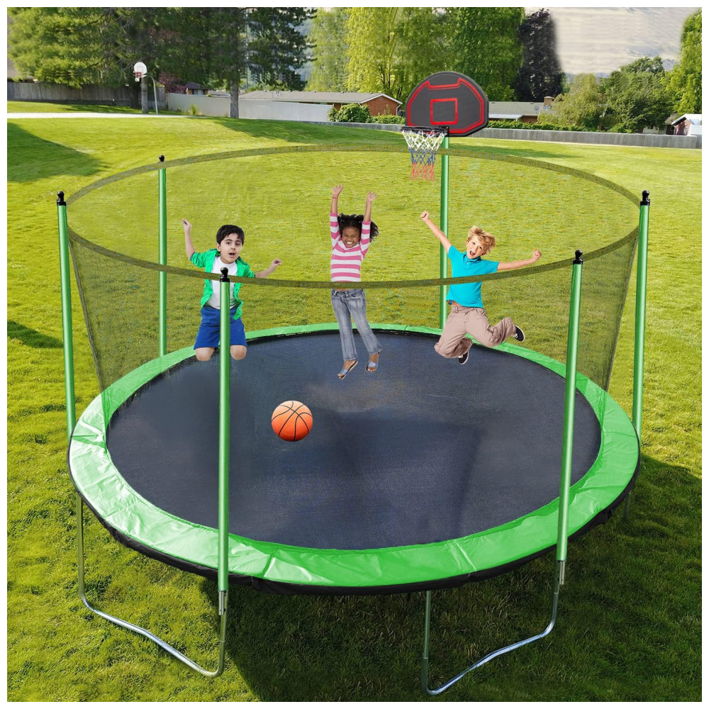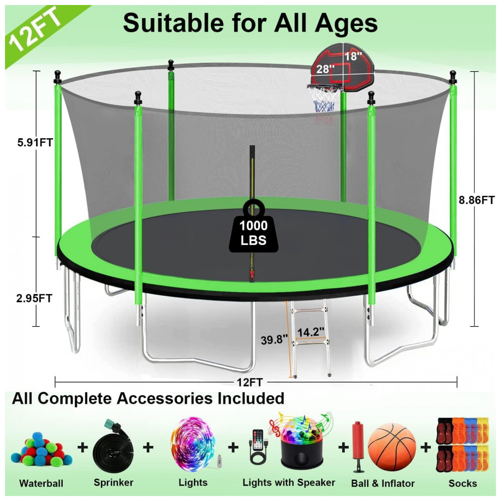 Goujxcy 12FT 14FT 15FT 16FT Trampolim para crianças e adultos 1500 LBS trampolins ao ar livre com cesta de basquete luzes sprinkler gabinete escada salto recreativo no quintal para crianças adolescentes 12 pés verde com luzes alto falante sprinkler