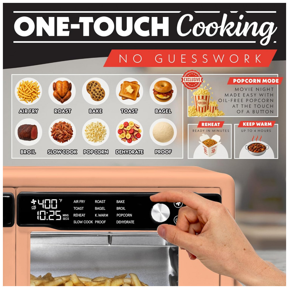 Funções pré-programadas (12): Air Fry, Bake, Toast, Roast, Broil, Dehydrate, Reheat, Keep Warm, Popcorn, Slow Cook, Proof e modos adicionais integrados