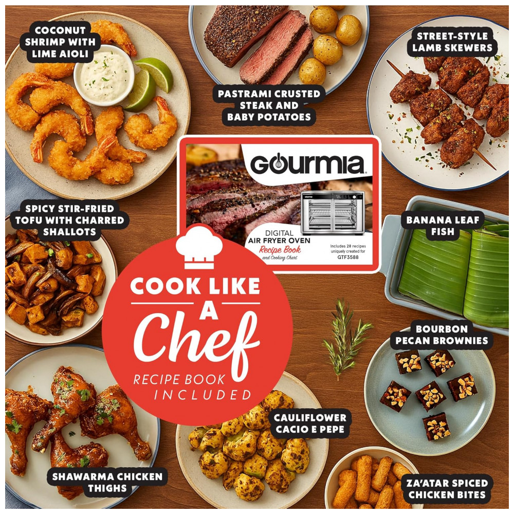 O Gourmia GTF3588S é um forno elétrico de bancada com portas francesas e capacidade aproximada de 35 litros (37 QT), projetado para funcionar como air fryer, forno de convecção e torradeira em um único equipamento. A cavidade comporta refeições familiares em assadeiras, pizzas de cerca de 33 cm e até 9 fatias de pão por ciclo. O sistema FryForce 360 utiliza circulação de ar quente com potência de 1700W, permitindo dourar e crocantar alimentos com pouco ou nenhum óleo.