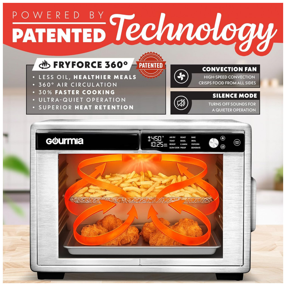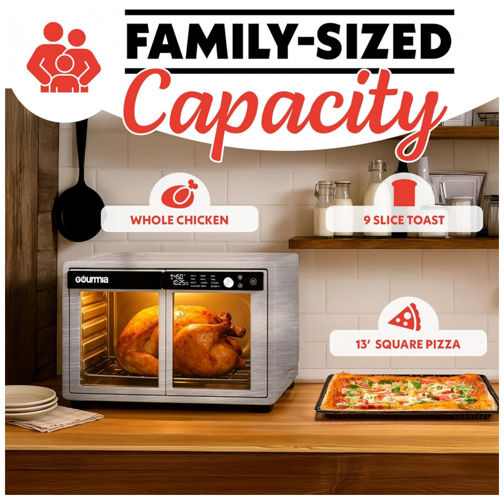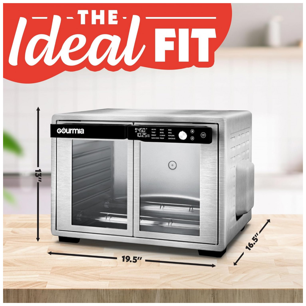 Gourmia Forno Air Fryer French Door 37 Qt Capacidade Grande 12 Funções Display Digital Aço Inox Prata