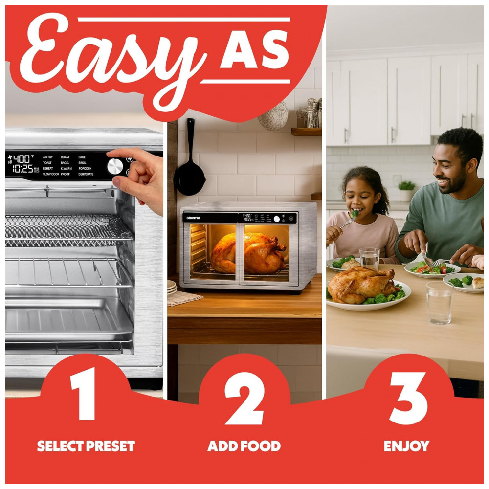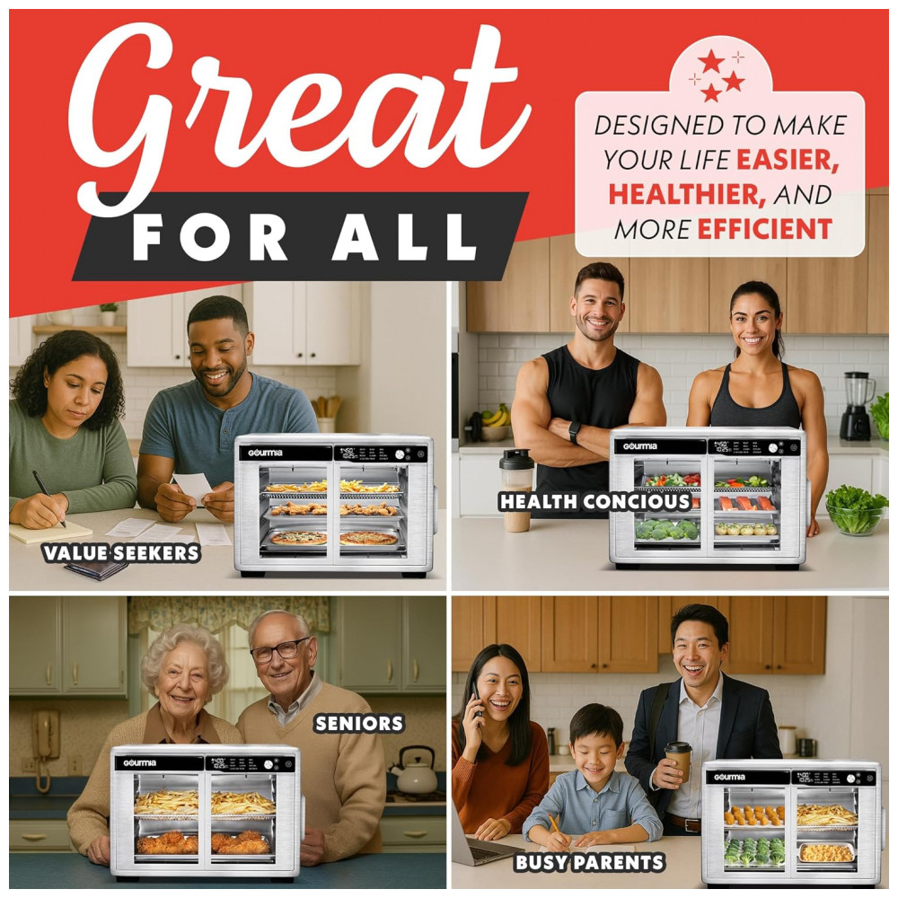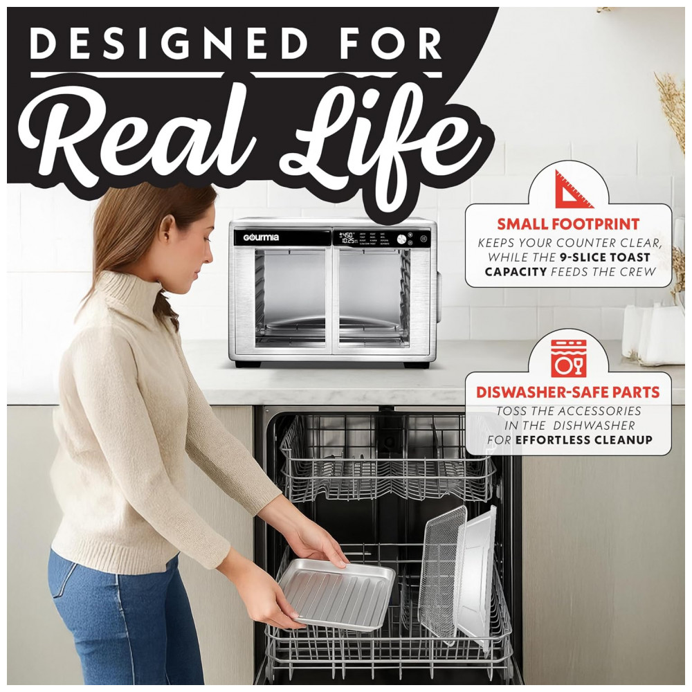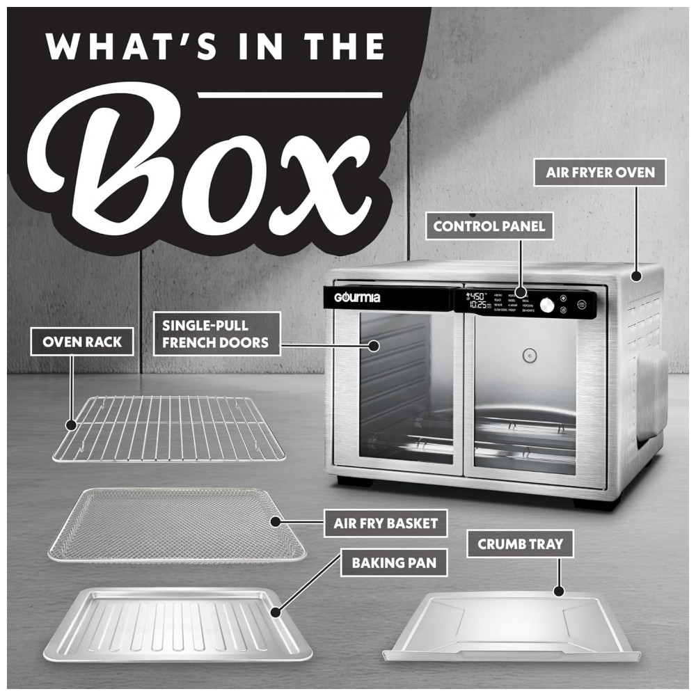 Gourmia Forno Air Fryer French Door 37 Qt Capacidade Grande 12 Funções Display Digital Aço Inox Prata