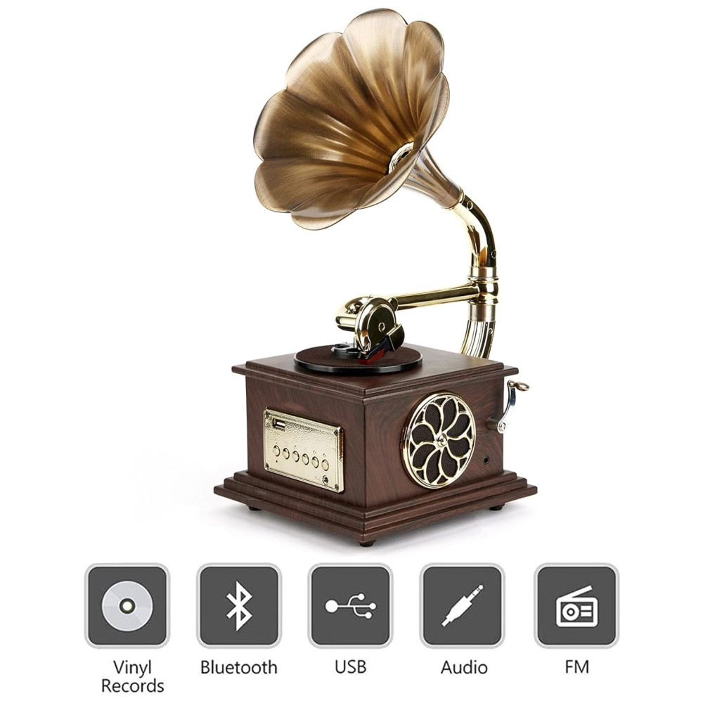 Mini, mas versátil plataforma giratória de duas velocidades 33, 45 RPM reproduz todos os seus discos de vinil 17,25 e 30 centímetros e álbuns favoritos Conexão Bluetooth para reproduzir música sem fio de seu dispositivo habilitado para Bluetooth smartphones, tablets, laptops, computadores, etc. Conexão de áudio de 3, Rádio FM Saída auxiliar Reprodução USB.