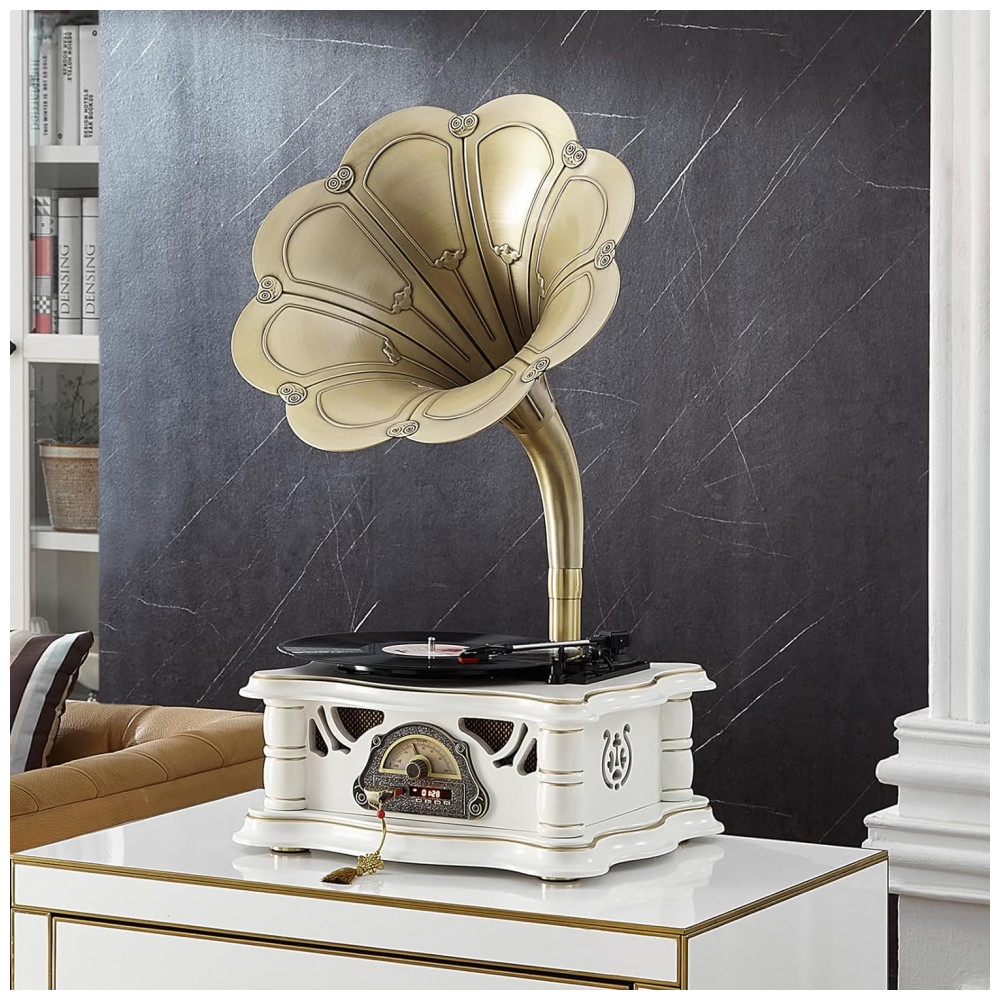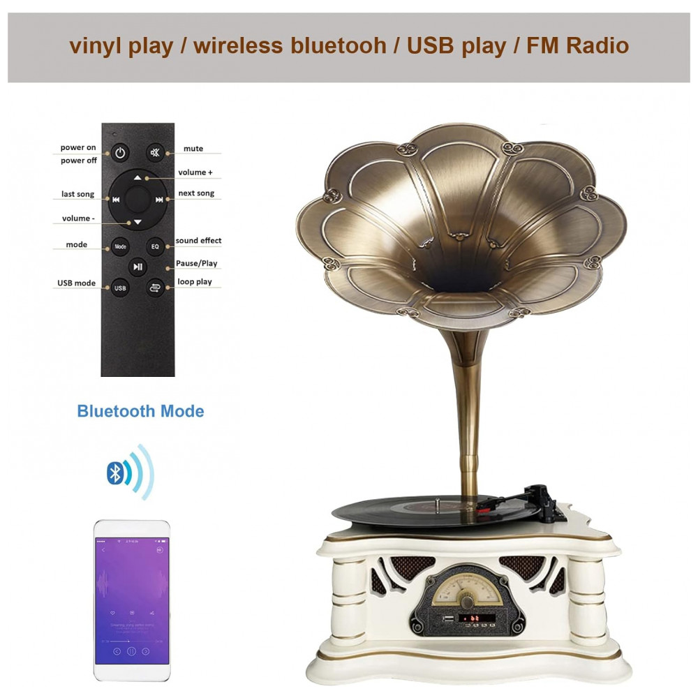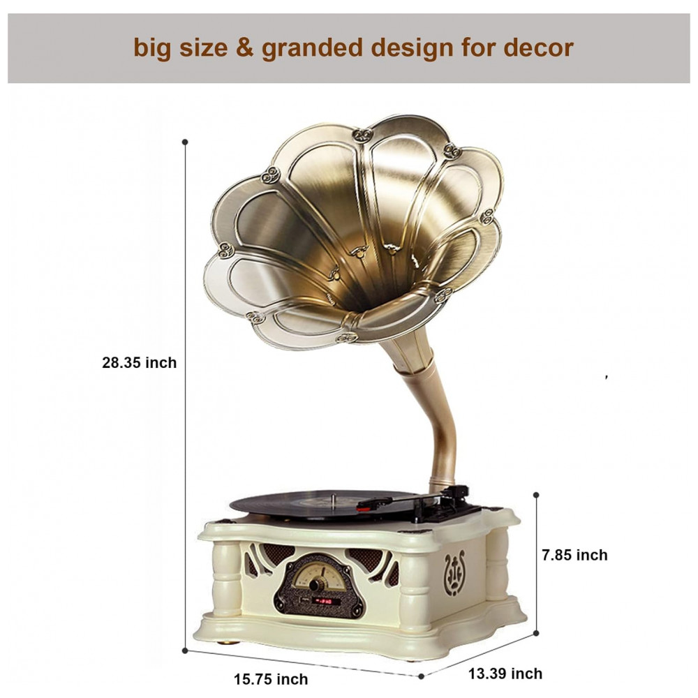 Design clássico de moda antiga design de estilo de arte retrô europeu com chifre de cobre puro. Apresentado com base de madeira resistente e trompete de metal banhado a cobre, este lindo fonógrafo vintage é sofisticado.