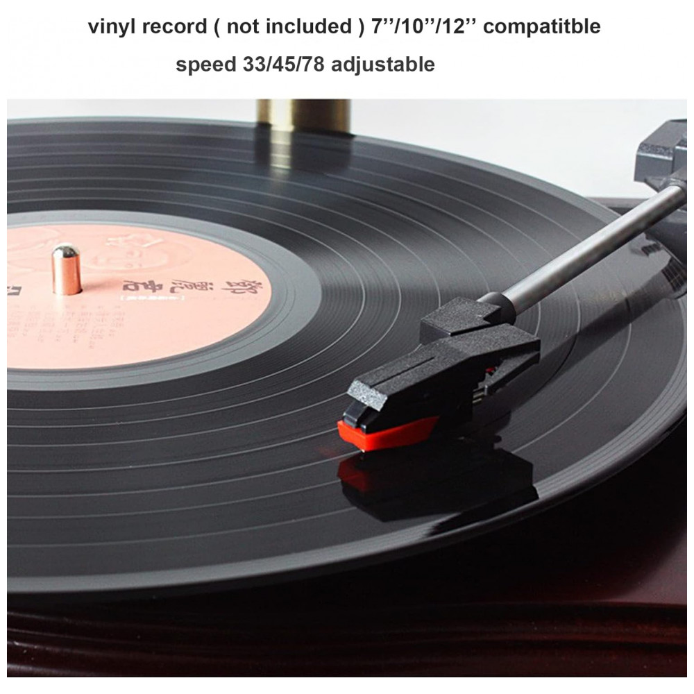 Efeito acústico estéreo profissional 2 alto falantes estéreo de gama completa integrados à esquerda e à direita um alto falante agudo de seda na parte superior um alto falante de baixo pesado na parte inferior. O efeito sonoro pode ser influenciado pela qualidade do vinil, pela qualidade da música mp3 e pela agulha. Sugerimos usar vinil e música mp3 com qualidade não destrutiva. Se houver algum problema de som, tente mudar para outro vinil, música USB ou uma nova agulha e veja se o problema foi resolvido. Contate nos para mais ajuda.