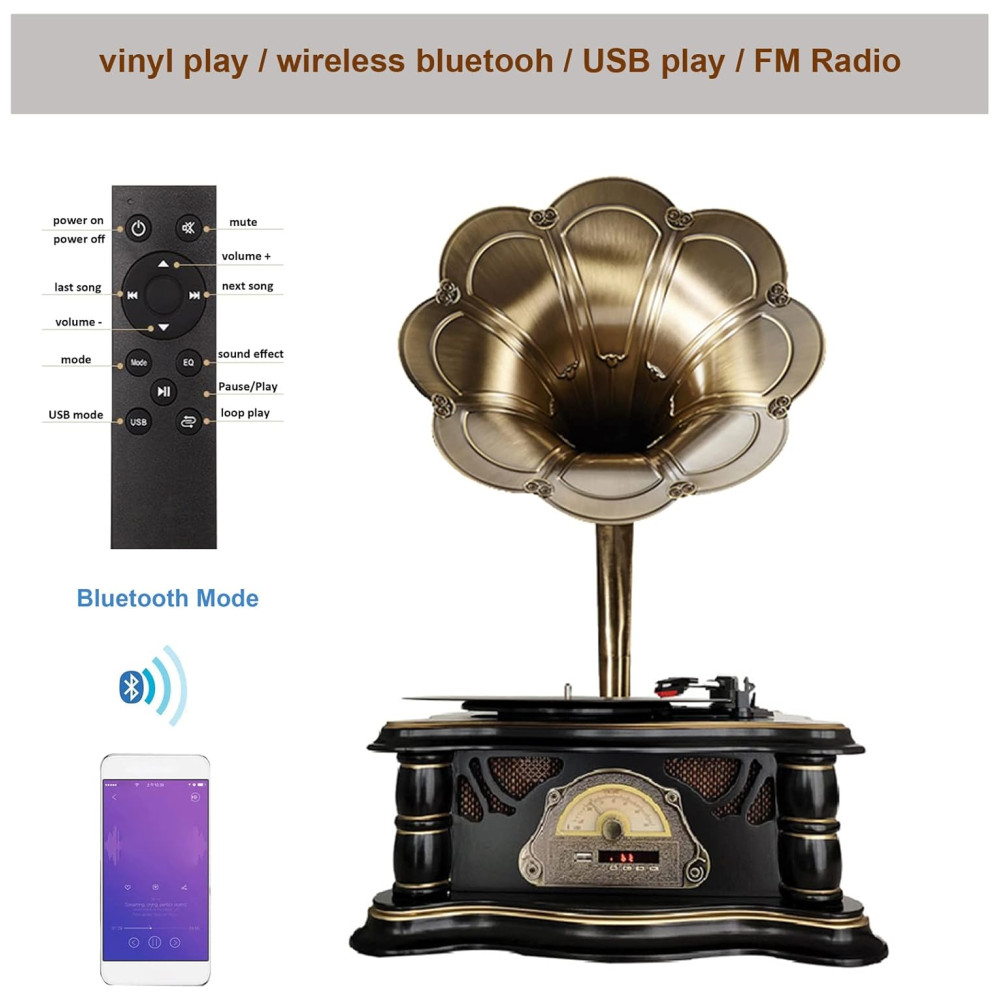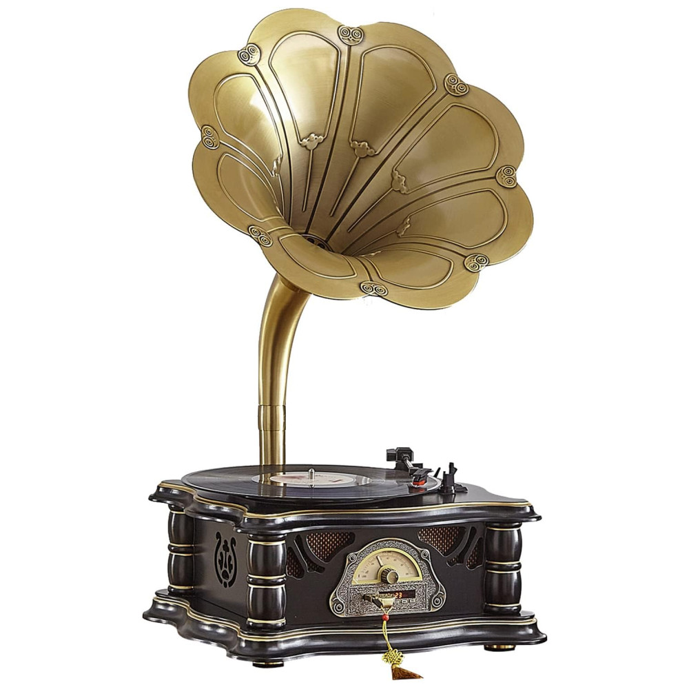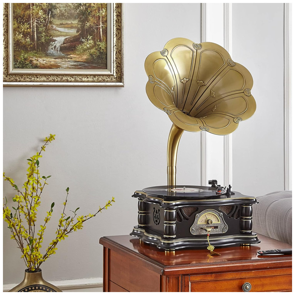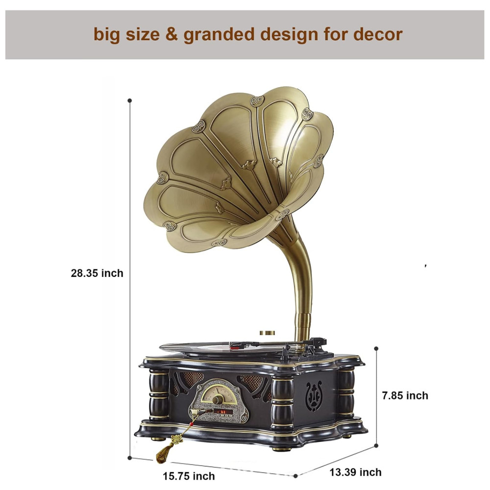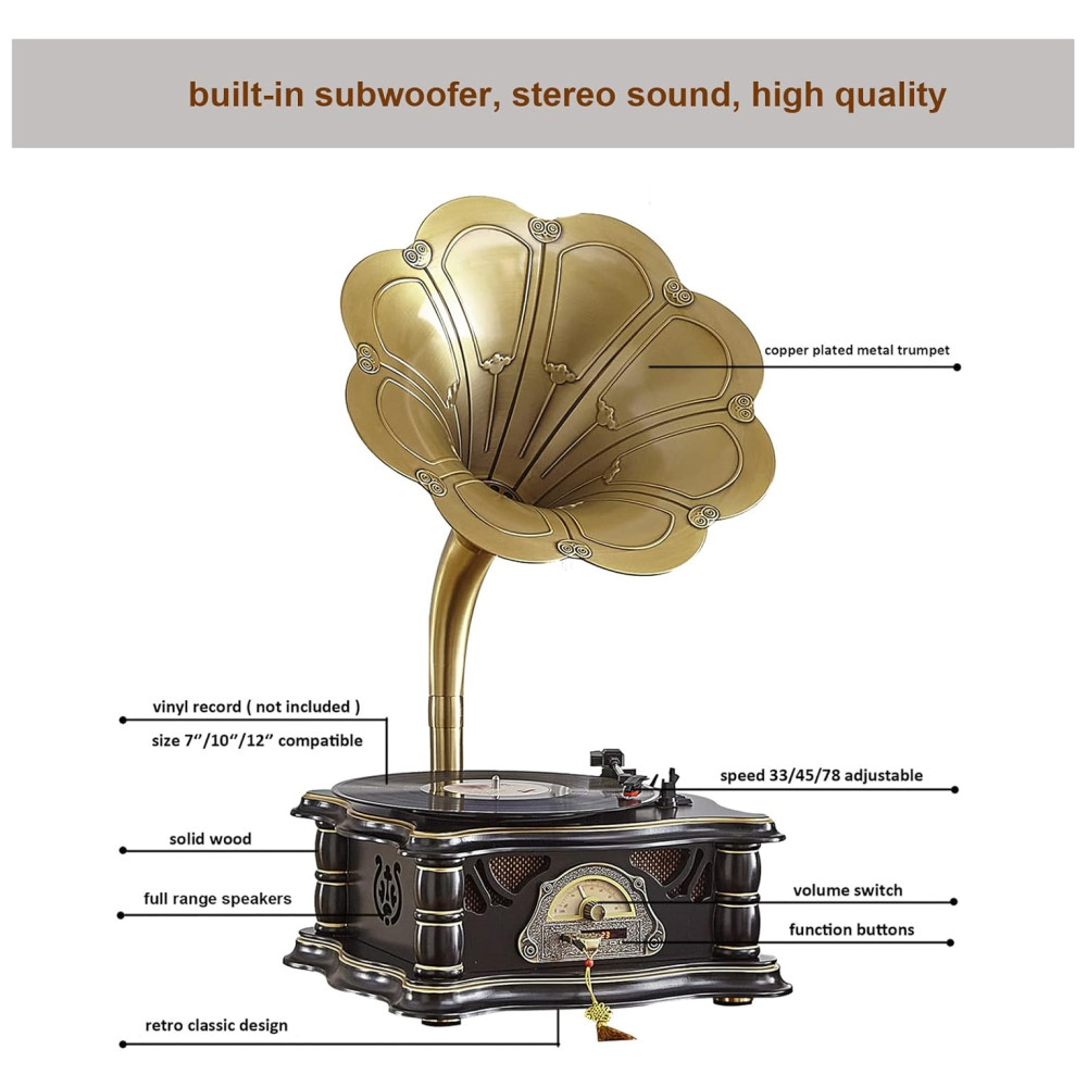 Design clássico de moda antiga design de estilo de arte retrô europeu com chifre de cobre puro. Apresentado com base de madeira resistente e trompete de metal banhado a cobre, este lindo fonógrafo vintage é sofisticado.