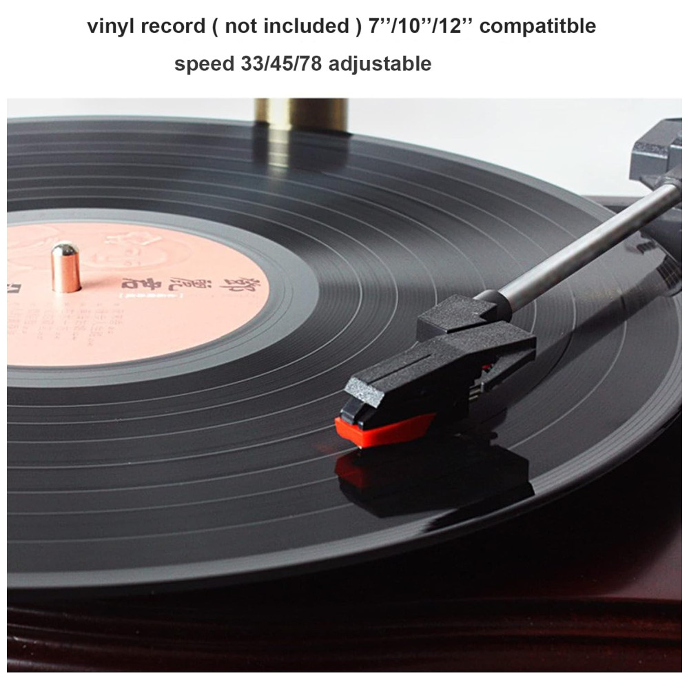 Efeito acústico estéreo profissional 2 alto falantes estéreo de gama completa integrados à esquerda e à direita um alto falante agudo de seda na parte superior um alto falante de baixo pesado na parte inferior. O efeito sonoro pode ser influenciado pela qualidade do vinil, pela qualidade da música mp3 e pela agulha. Sugerimos usar vinil e música mp3 com qualidade não destrutiva. Se houver algum problema de som, tente mudar para outro vinil, música USB ou uma nova agulha e veja se o problema foi resolvido. Contate nos para mais ajuda.