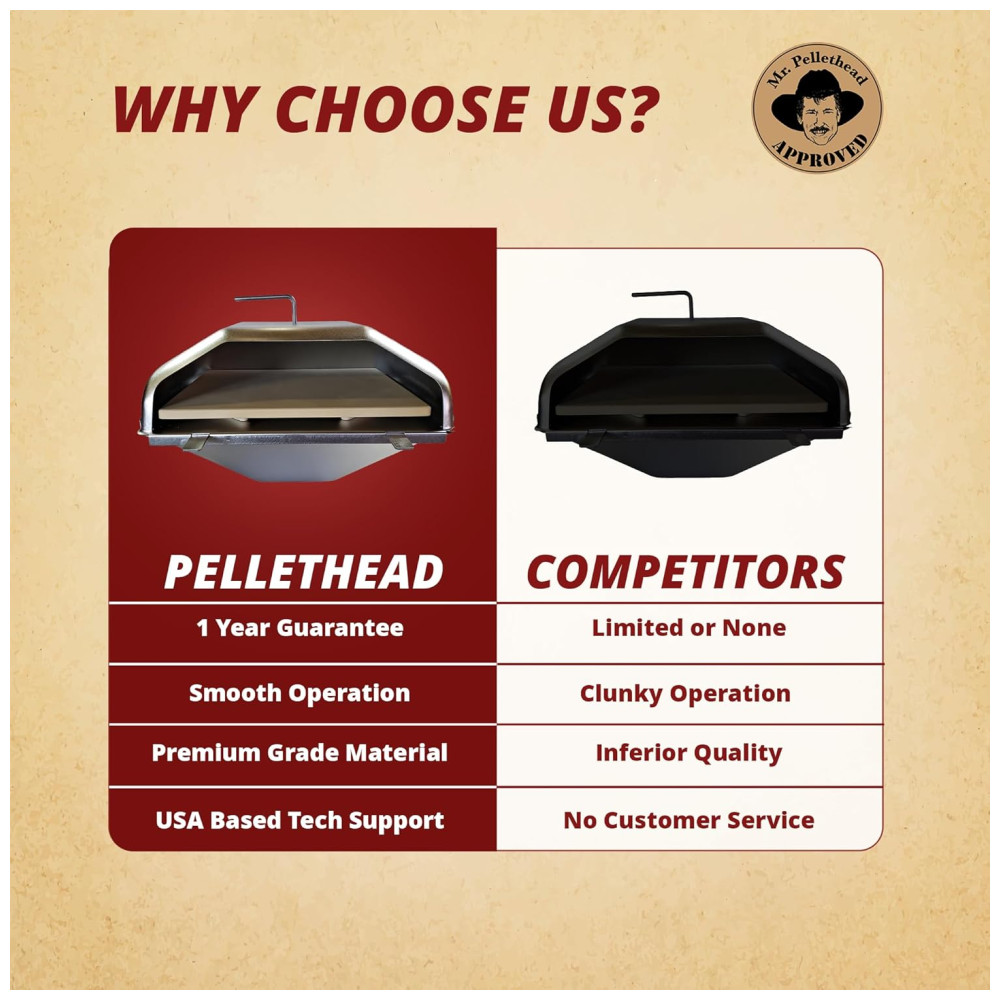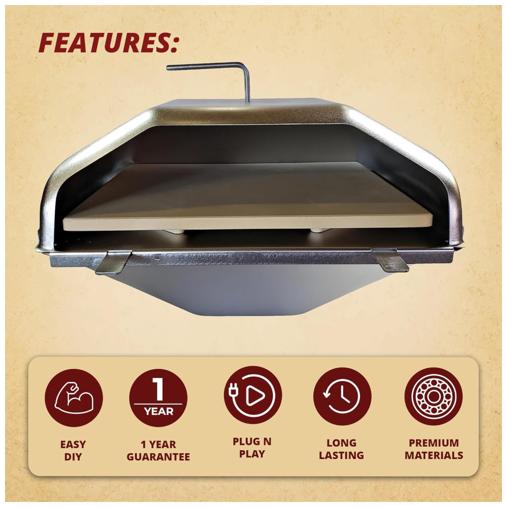O acessório do forno de pizza aumenta a temperatura interna da sua grelha de pellets para a de um forno de pizza a lenha real, canalizando o calor da caixa de fogo diretamente para a câmara de cozimento de pedra. Isso cria temperaturas acima de 800F