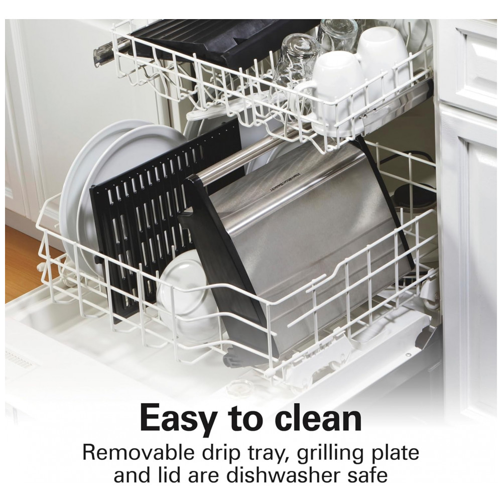 Fácil de limpar a cobertura da churrasqueira interna, a placa e a bandeja coletora extragrande são removíveis e podem ser lavadas na máquina de lavar louça