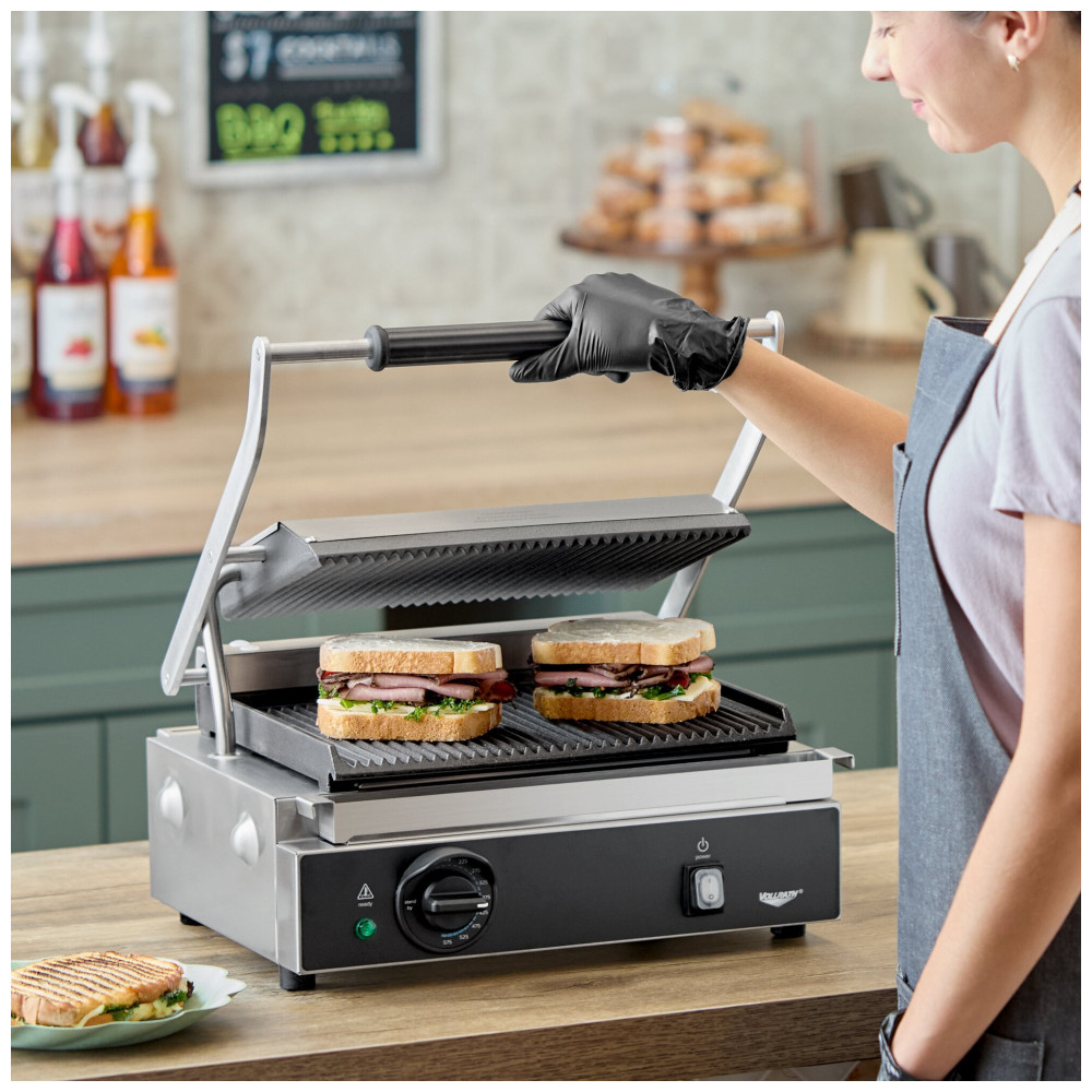 A grelha panini simples Vollrath PSG4-SG120 é um equipamento elétrico projetado para grelhar sanduíches, hambúrgueres, vegetais e frango em cozinhas comerciais. Possui design compacto de perfil baixo, com placas de ferro fundido sulcadas nas faces superior e inferior, que retêm calor de forma eficiente e acomodam espessuras variadas de alimentos graças à ação pivotante da placa superior.