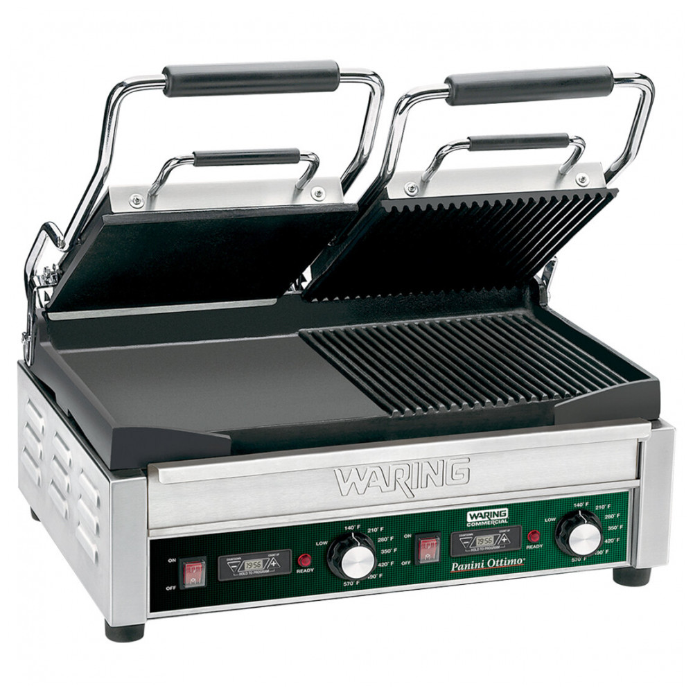 A grelha panini comercial Waring WDG300T dual oferece duas superfícies de cozimento independentes de 43 x 23,5 cm: lado esquerdo liso e direito ranhurado, ambas em ferro fundido, para sanduíches panini, frango, vegetais e hambúrgueres em menus de almoço e jantar leve. Com 3120W de potência, timer integrado e termostato até 300°C, suporta uso medium duty em cozinhas profissionais com operação simultânea das placas.