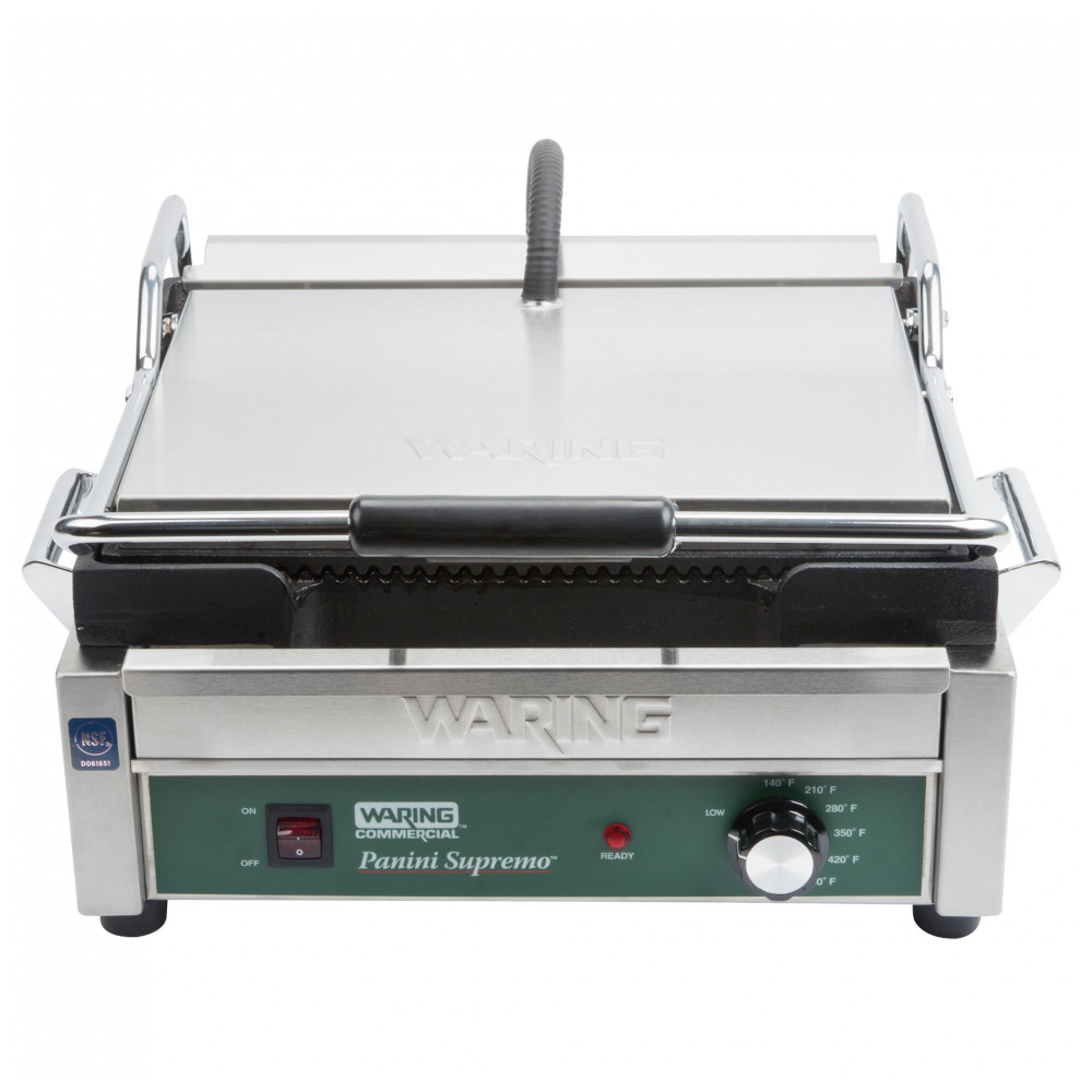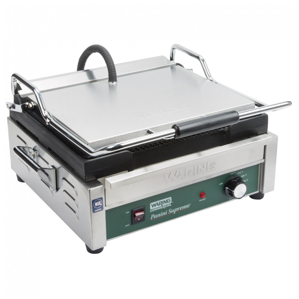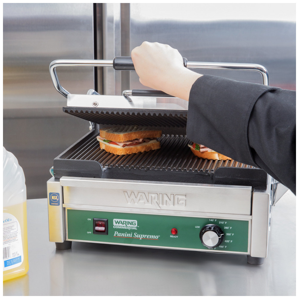 A grelha panini comercial Waring WPG250B inox oferece superfície de cozimento ranhurada de 37 x 28 cm em ferro fundido para grelhar sanduíches panini, frango, vegetais e hambúrgueres em delis, cafés e operações de foodservice. Com 2808W de potência, placa superior com hinge auto-balanceada para itens até 7,6 cm de espessura, e termostato ajustável até 299°C, suporta uso medium duty em preparos de almoço e jantar leve.