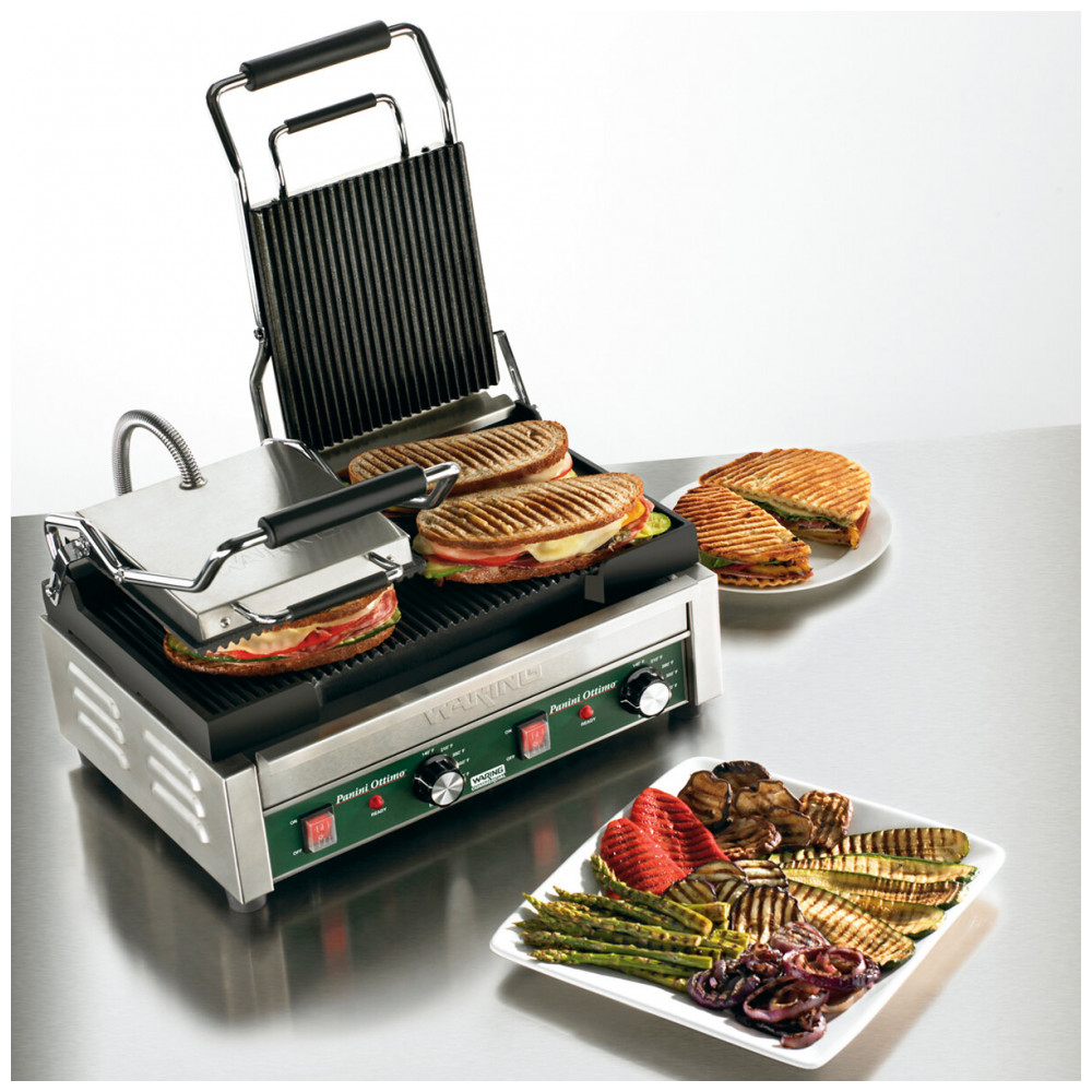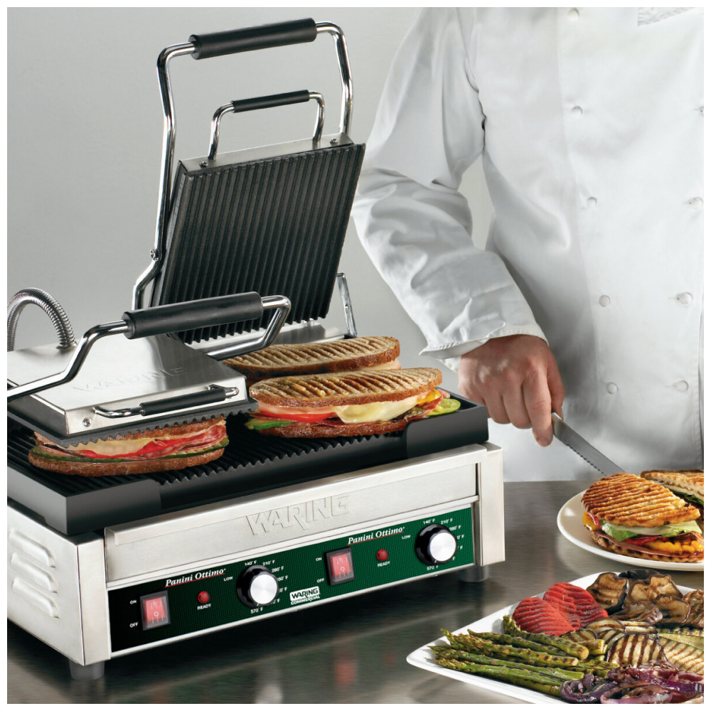 O grelha panini comercial Waring WPG300 inox possui superfície de cozimento ranhurada de 43 x 23,5 cm em ferro fundido para preparar sanduíches panini, bagels do café da manhã, hambúrgueres e burritos grelhados em alto volume. Com 3120W de potência e configuração dual para itens até 7,6 cm de espessura, opera em uso medium duty com termostato ajustável até 299°C, otimizando eficiência em cozinhas de foodservice.