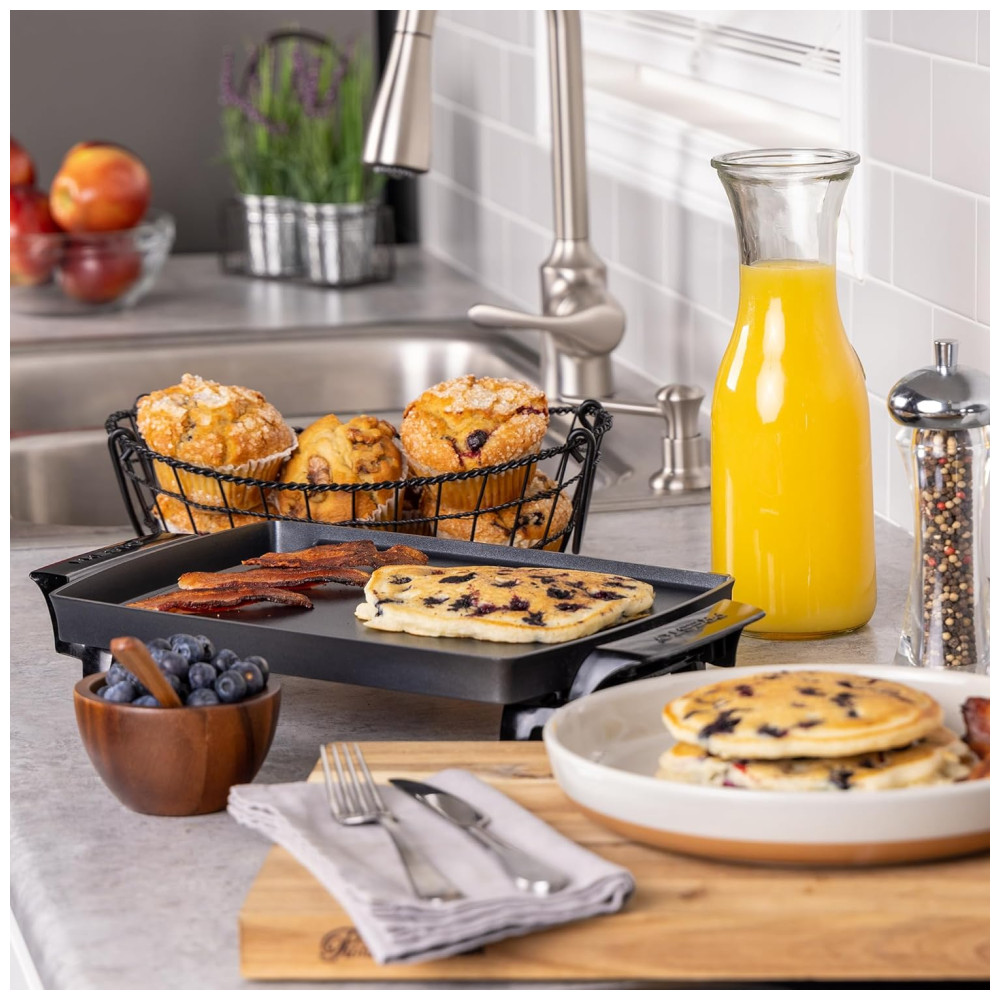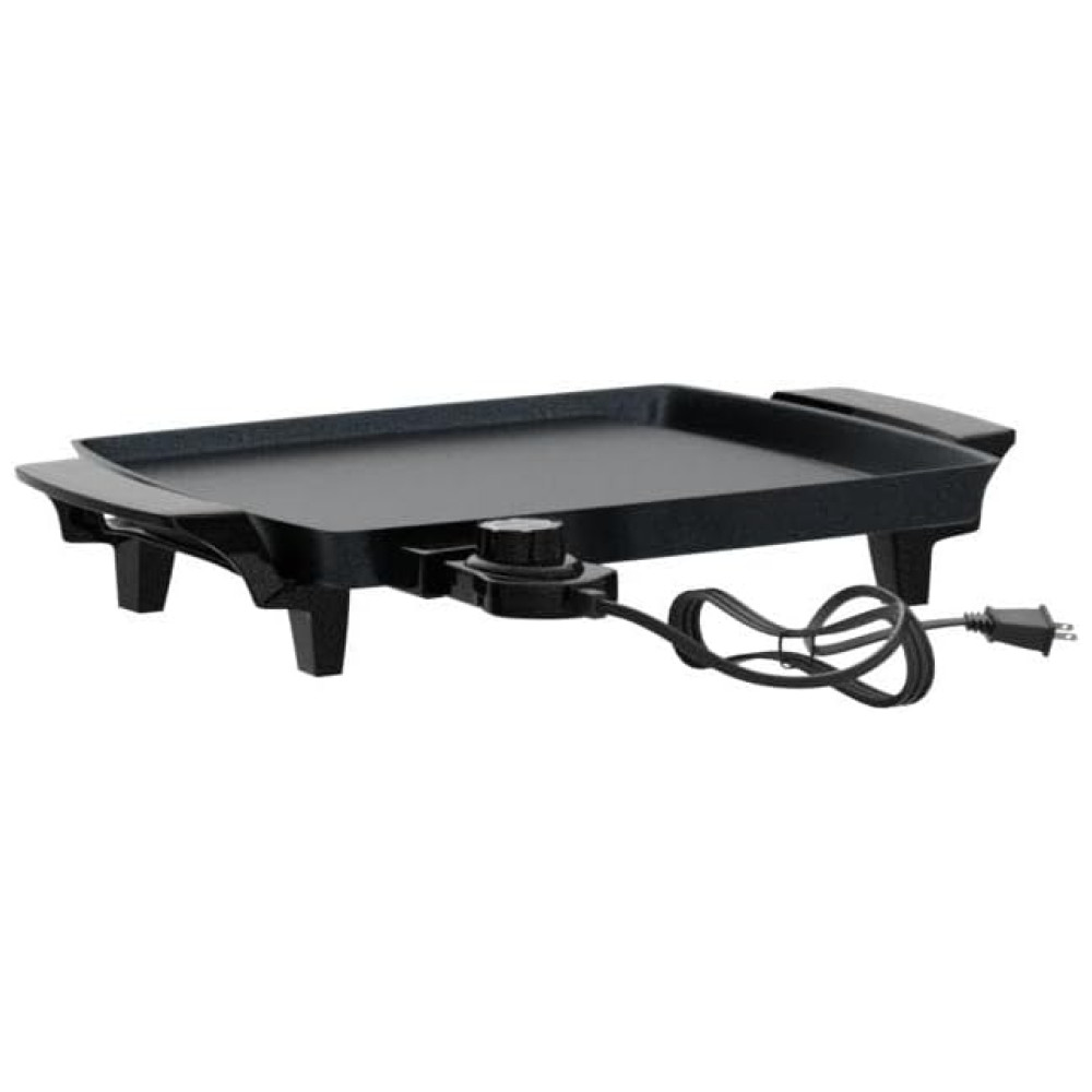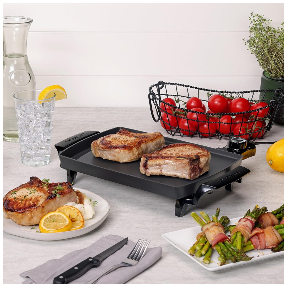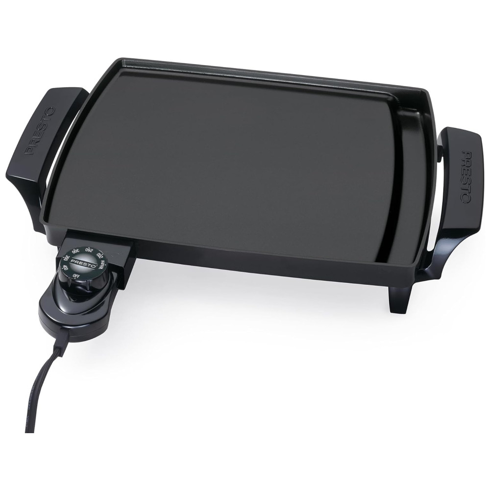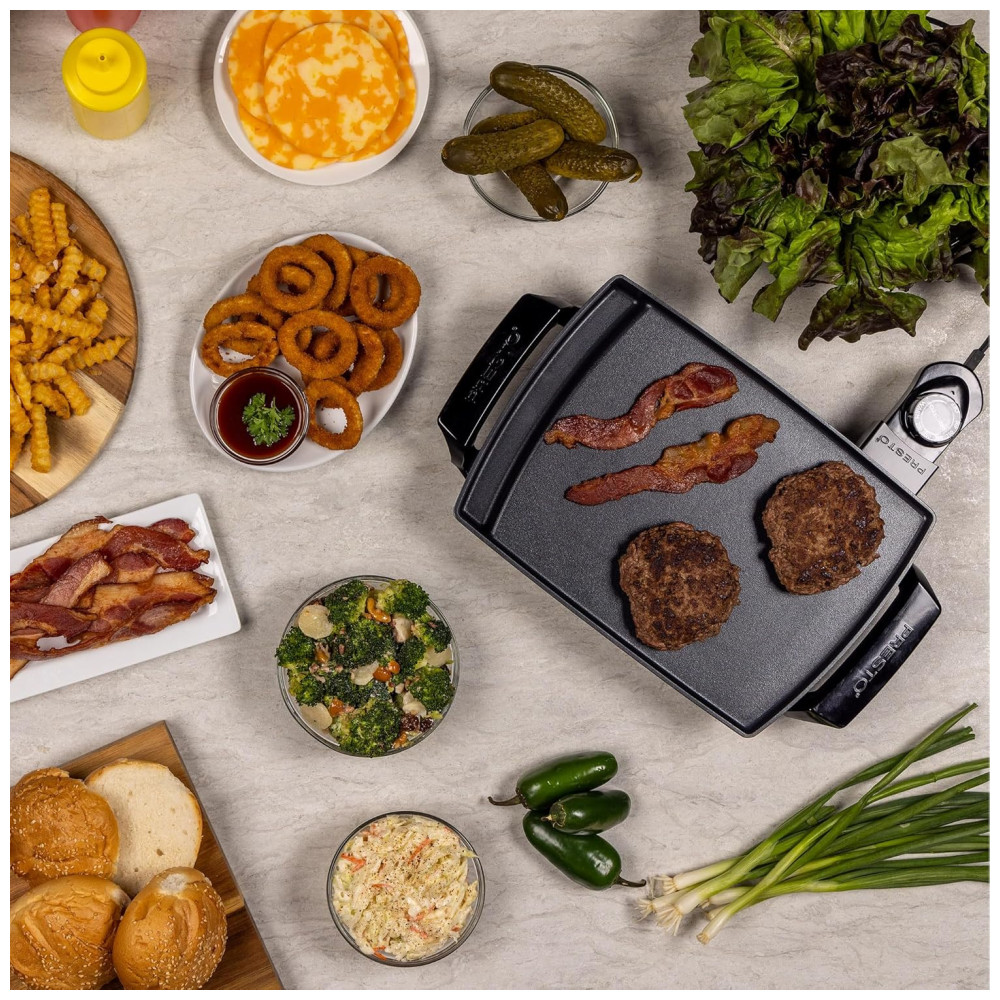 O grill elétrico compacto Presto 07211 Liddle Griddle possui superfície de cozimento de 21,6 cm x 26,7 cm revestida com camada antiaderente cerâmica livre de PFAS, permitindo preparo de alimentos com mínima necessidade de gordura. Ideal para cozinhar até quatro ovos fritos ou duas porções maiores simultaneamente.