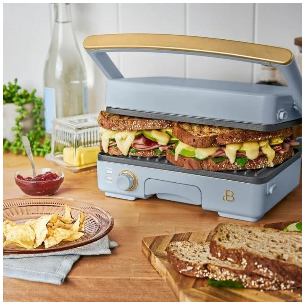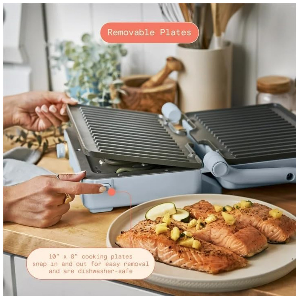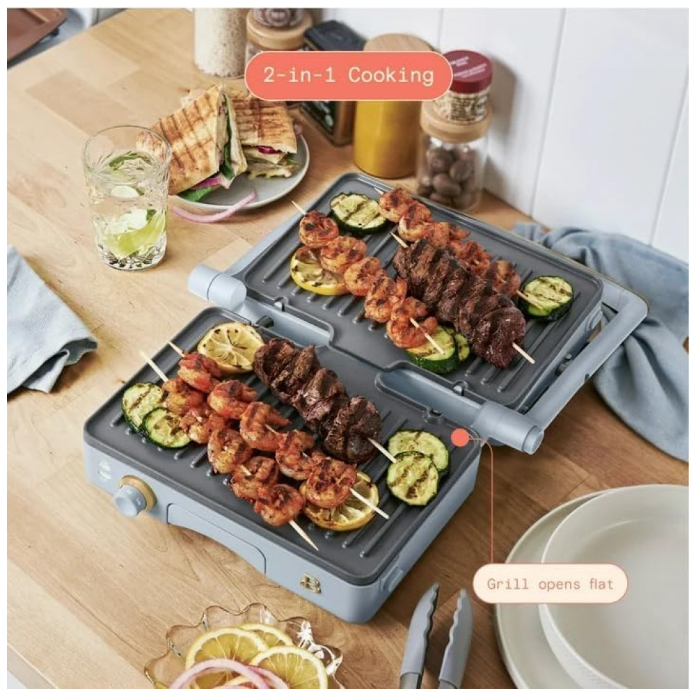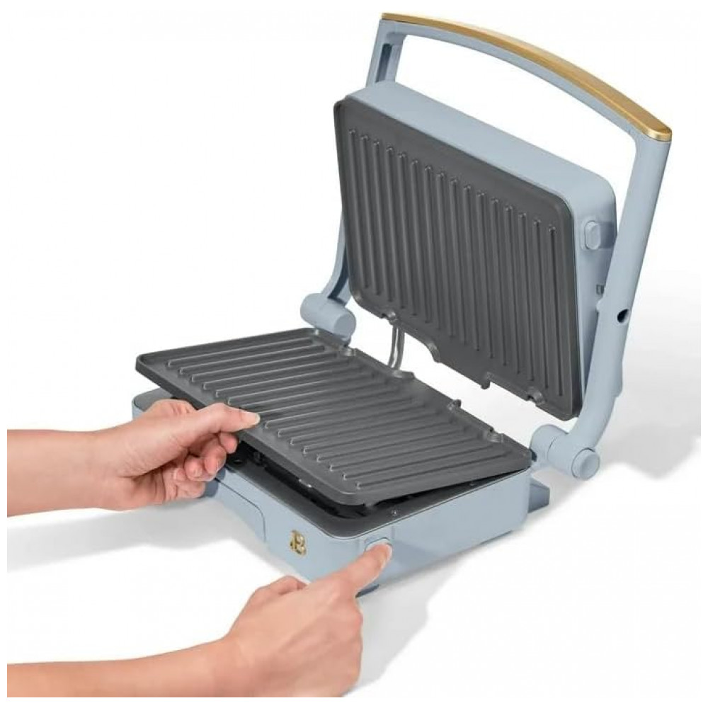 O grill elétrico e prensa para panini Beautiful 2 em 1 na cor azul cornflower foi projetado para preparo de sanduíches prensados e grelhados em ambiente interno, unindo função de prensa e grill em um único equipamento compacto. As chapas de cozimento possuem superfície antiaderente e área útil aproximada de 26 cm x 17,8 cm, adequadas para preparar dois paninis ao mesmo tempo.