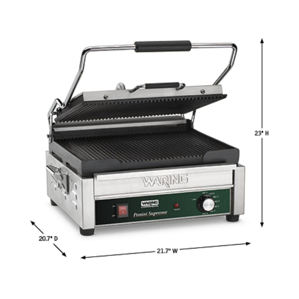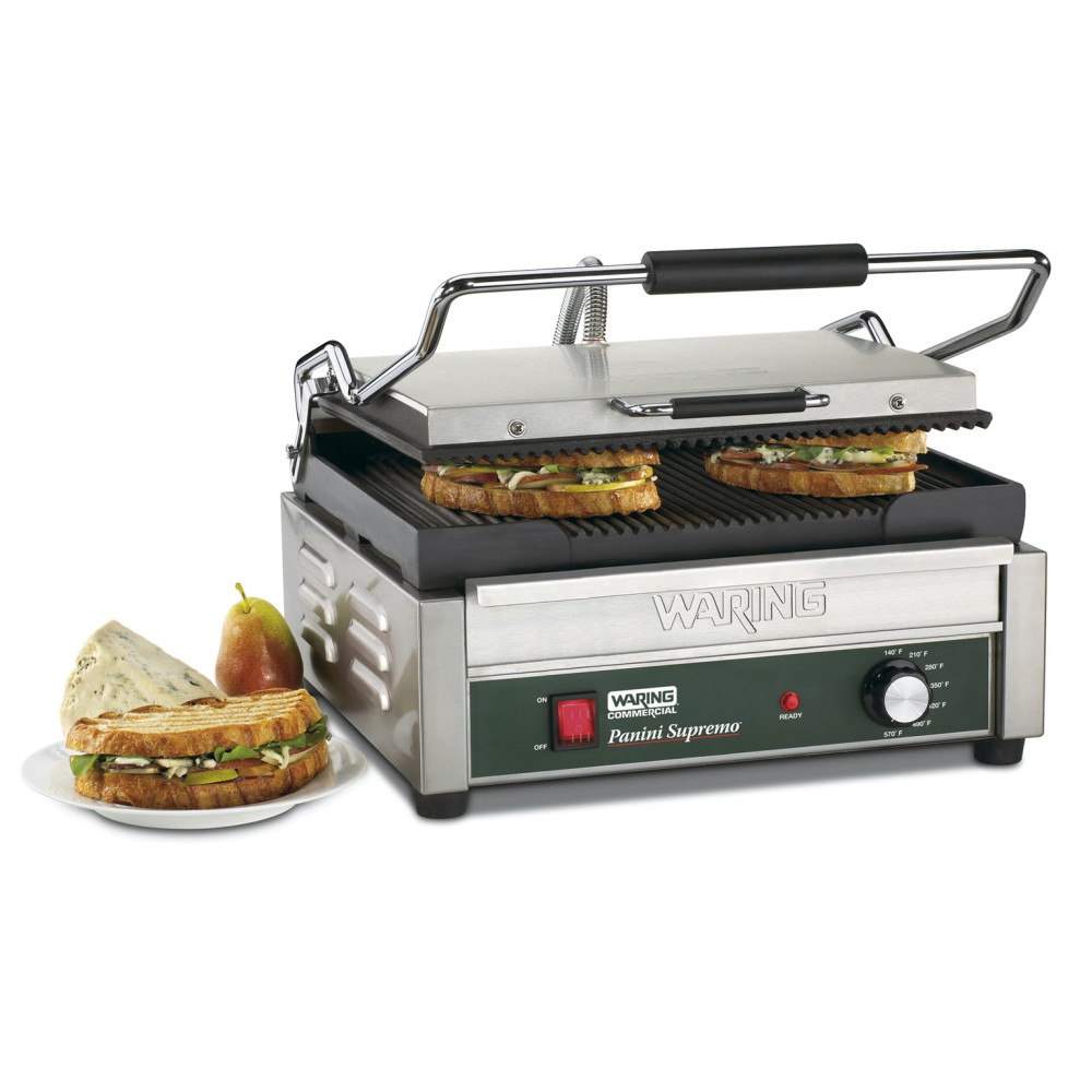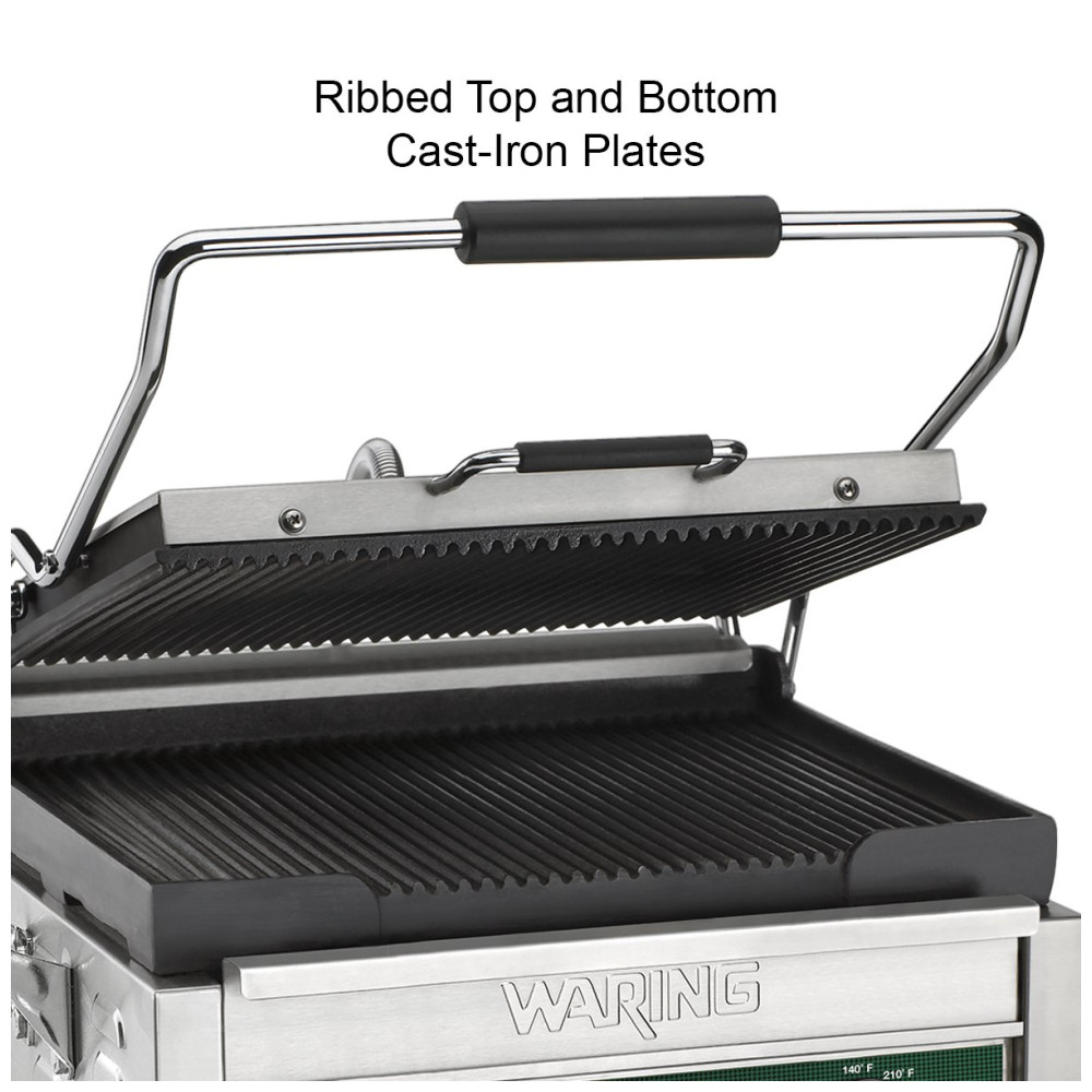 Prepare deliciosos sanduíches panini e uma variedade de pratos grelhados com facilidade utilizando a grelha grande Panini Waring WPG250B 208V. Equipada com placas de ferro fundido ranhuradas, esta grelha aquece de maneira uniforme e cozinha rapidamente sanduíches, hambúrgueres, frango e vegetais com espessuras de até 7 cm.