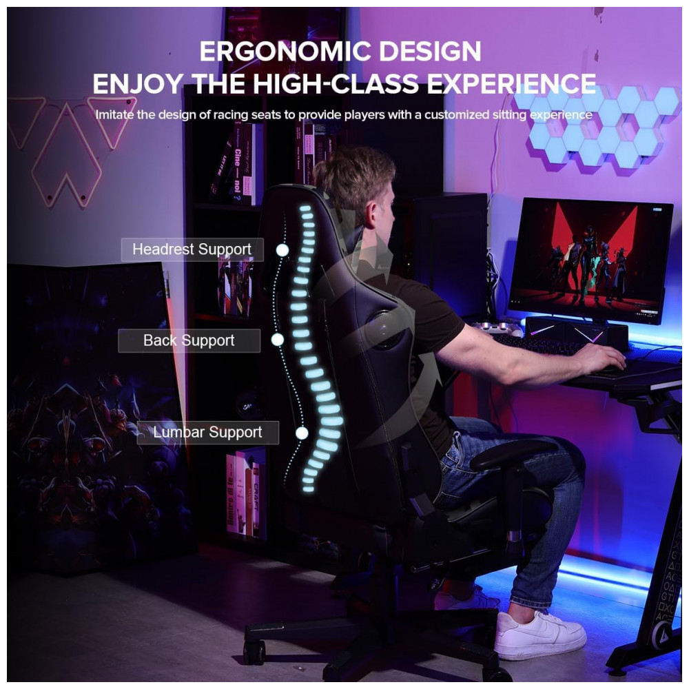 Design ergonômico estrutura de metal forte projetada para ajudar a promover uma posição sentada confortável, mantendo você confortável após longas horas de jogo ou trabalho. O encosto e o assento acolchoados espessos e o apoio para os pés retrátil são perfeitos para relaxar.