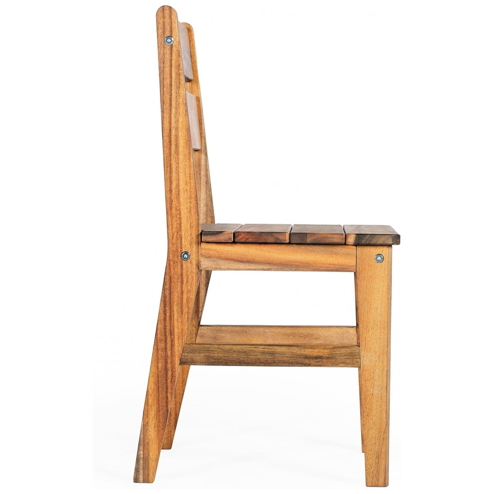 A estrutura em madeira maciça de acácia é naturalmente resistente às intempéries, suportando exposição ao sol, chuva e umidade dentro das rotinas de manutenção indicadas para mobiliário externo. O assento plano com encosto vertical oferece apoio para permanência em atividades mais longas, como leitura, escrita ou projetos em grupo, com capacidade de carga de até aproximadamente 56,7kg por cadeira.