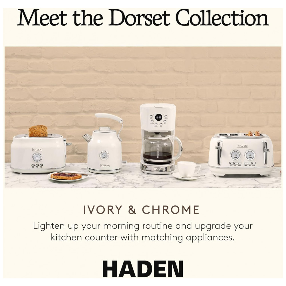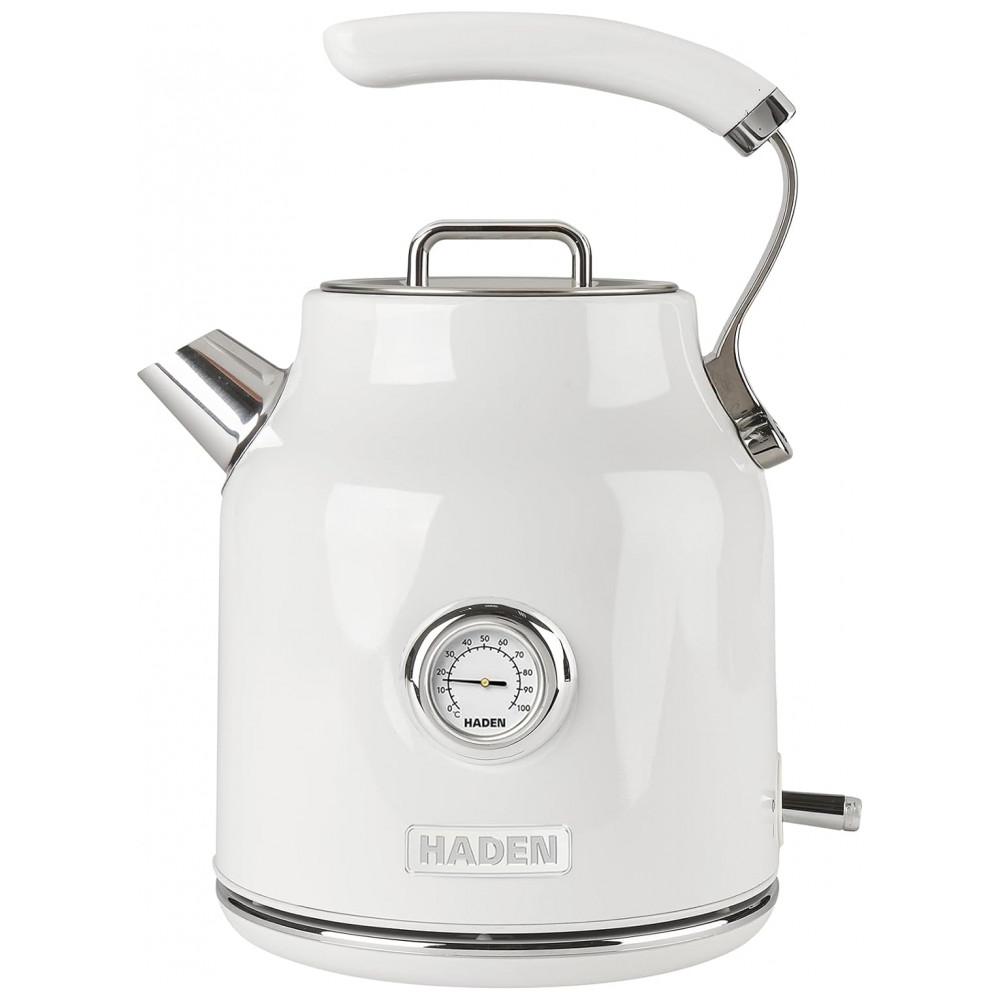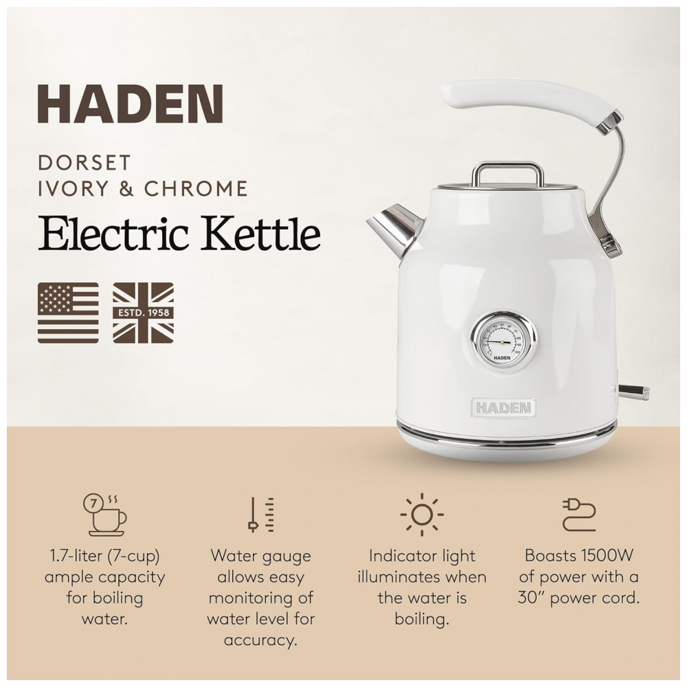 Transforme suas manhãs com a chaleira elétrica Dorset da HADEN, onde o estilo clássico se encontra com a modernidade para elevar sua cozinha. Confeccionada em aço inoxidável com acabamento em esmalte marfim e detalhes em cromo, esta chaleira oferece limpeza, qualidade e desempenho excepcionais. Seu design moderno e funcional garante facilidade no uso diário, tornando-a a escolha perfeita para quem valoriza praticidade e elegância. A base giratória de 360 graus proporciona estabilidade e liberdade de movimento ao posicionar a chaleira em qualquer direção. Equipada com recursos de segurança indispensáveis, como desligamento automático e proteção contra funcionamento a seco, ela oferece tranquilidade ao ferver água para chás, cafés ou uso geral na cozinha. Com capacidade ampla de 1,7 litros (aproximadamente 7 xícaras), a Dorset permite preparar grandes quantidades de água com rapidez e eficiência. Seu cabo robusto e ergonômico assegura controle total e uma pegada firme ao servir. Parte da Coleção Dorset, a chaleira apresenta um design simples e amigável, com acabamentos sofisticados que realçam a beleza do seu balcão. Desde 1958, a HADEN combina design britânico tradicional com tecnologia inovadora, sendo a marca de confiança para eletrodomésticos que unem forma e função em perfeita harmonia, inspirada nos lares e paisagens britânicas.