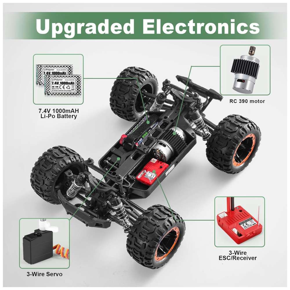 Tempo de jogo extra longo Os caminhões RC usam um pacote de bateria Li Po recarregável de 7,4 V 1000 mAH. Ele oferece aceleração e força imediatas. Uma bateria extra idêntica é fornecida para estender o tempo de direção e sua felicidade.