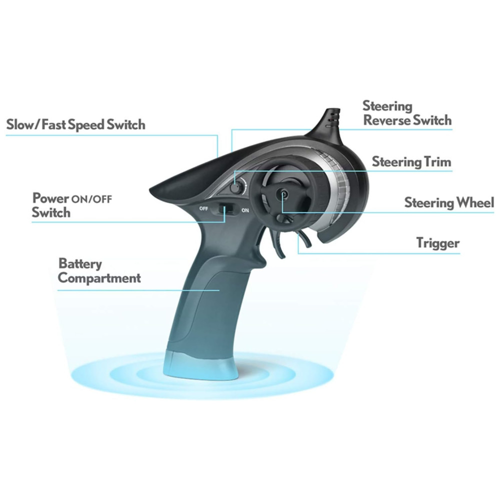 O sistema de controle de rádio proporcional de função total de 2,4 GHz é suficiente para um alcance de controle estável dentro de 85 m. A transmissão confiável para frente, freio e ré nunca falharia. Componentes eletrônicos à prova dágua Splash fazem deste caminhão um veículo todo o terreno. Não se preocupe em conduzir este caminhão em pastagens, areias e terrenos acidentados.