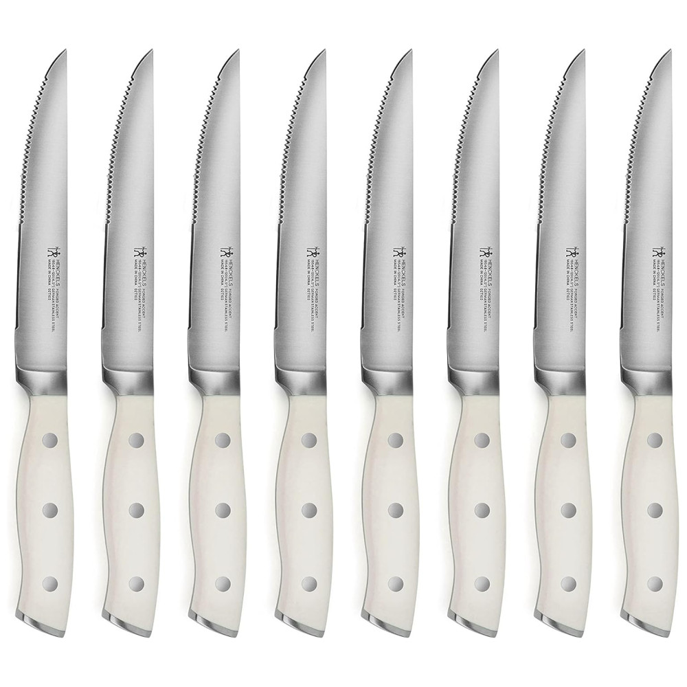 Todas as lâminas, incluindo as facas de bife, são uma construção forjada com alças POM esbranquiçadas com rebites triplos e tripla espiga