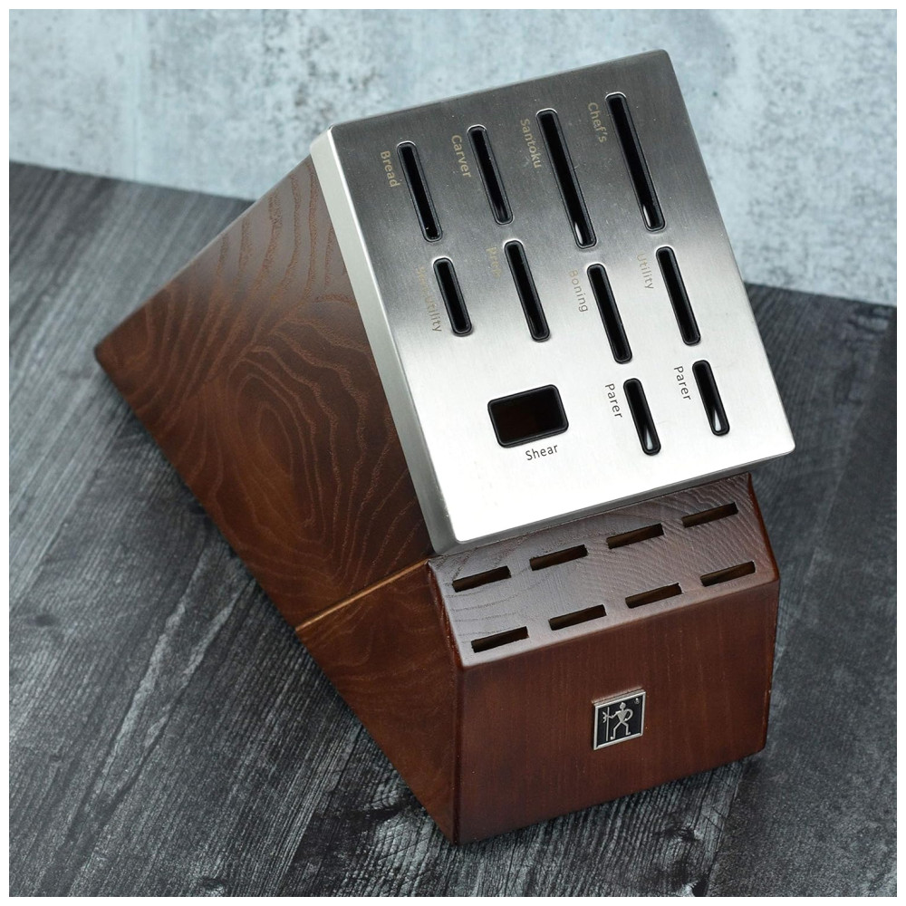 Bloco de faca autoafiador inovador feito de madeira de alta qualidade com um acabamento luxuoso de nogueira e superfície de aço inoxidável Cada uma das ranhuras é etiquetada e cada ranhura para as facas de ponta fina inclui hastes de amolar de cerâmica embutidas no ângulo apropriado, então a faca será afiada continuamente durante o uso normal conforme você insere e remove as facas do bloco.