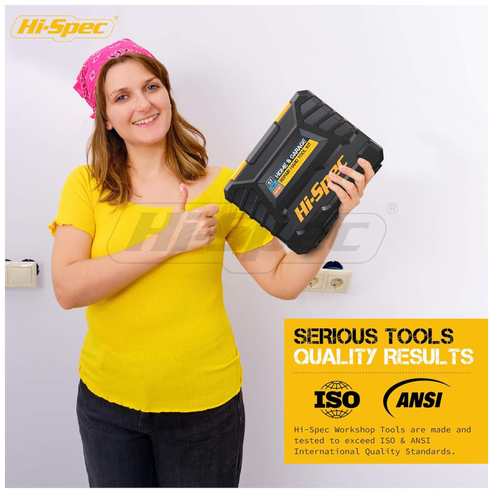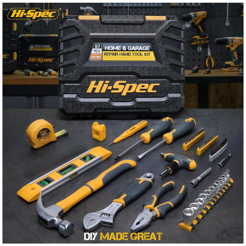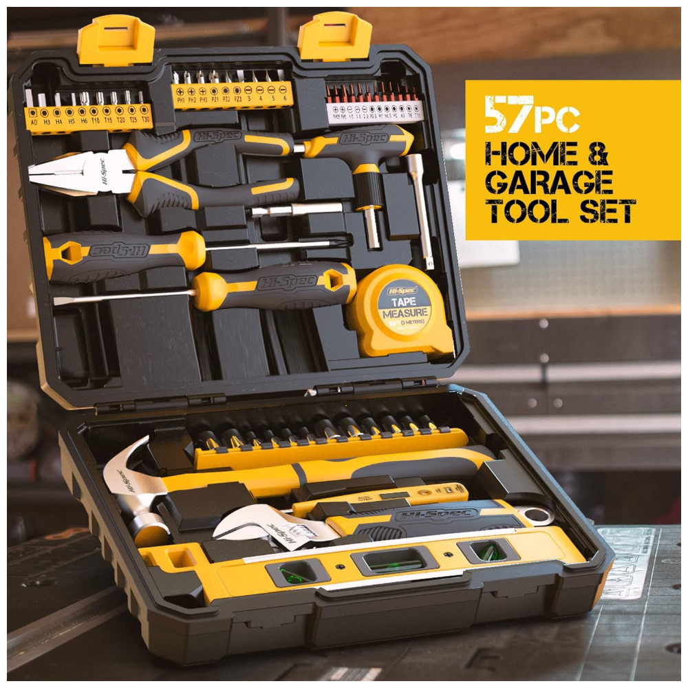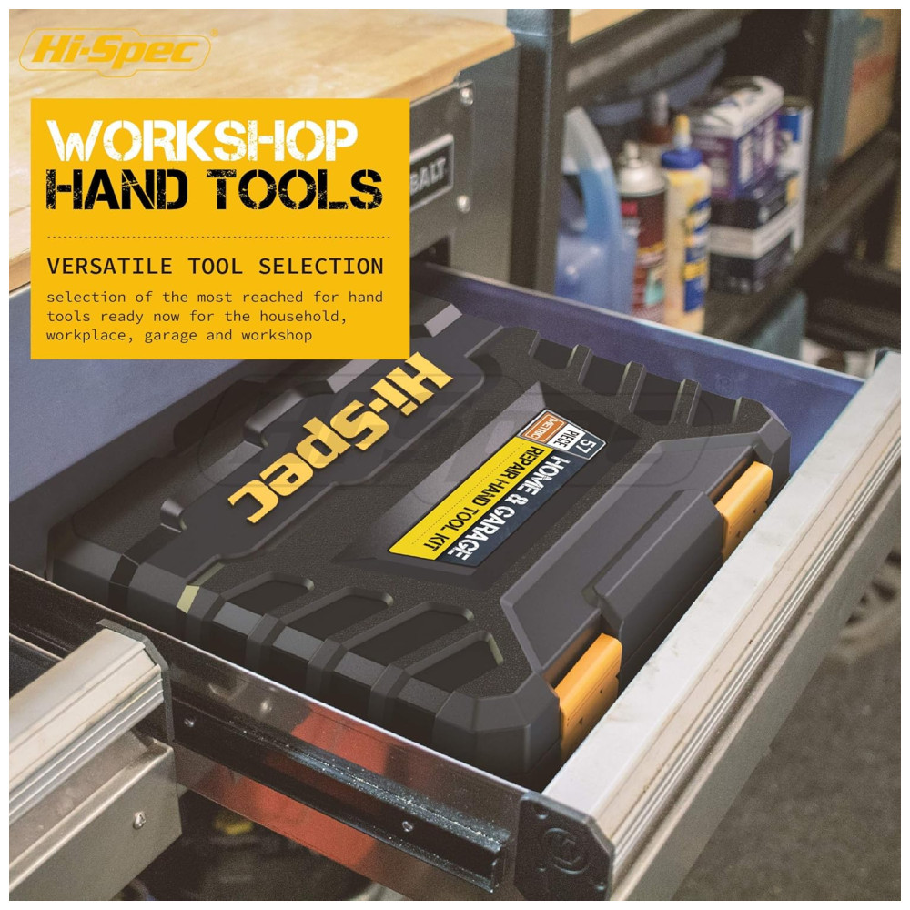AQUI E PRONTO Conclua os trabalhos com mais facilidade e rapidez com o conjunto de kits de ferramentas para casa e garagem de 57 peças Hi Spec. Embalado com as ferramentas manuais mais alcançadas para iniciantes a usuários experientes que precisam de correções agora. Tudo em uma caixa de ferramentas dobrável e grossa com travas de pressão fortes