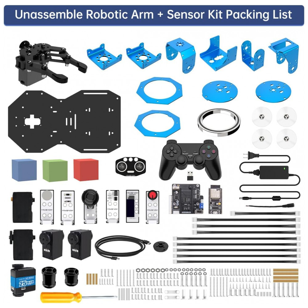 Conteúdo da embalagem: Braço robótico xArm, placa controladora ESP32, pacote de sensores de expansão (7 módulos + acessórios), cabos de alimentação, manual de programação e ensino