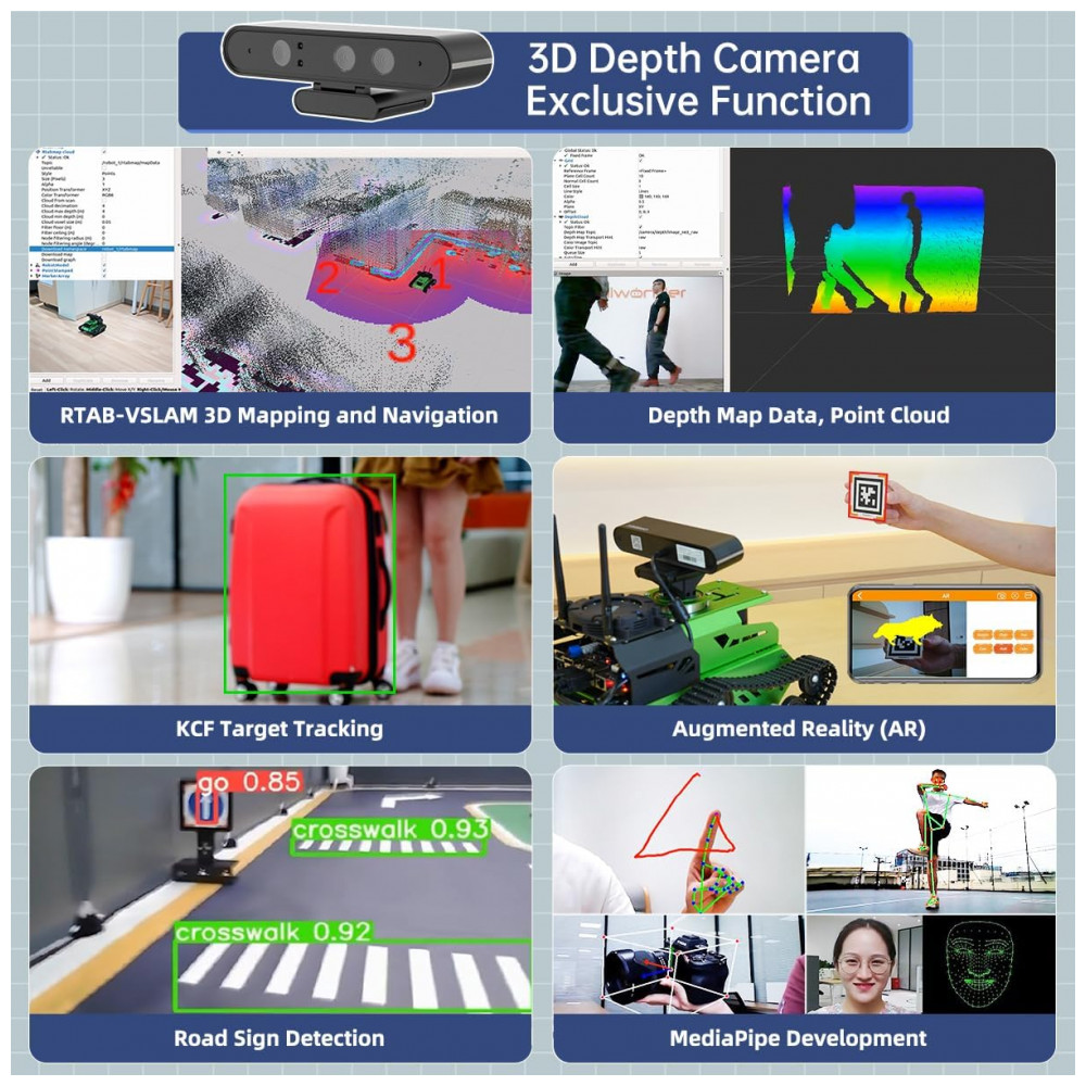 Compatível com o Robot Operating System (ROS), o JetTank suporta algoritmos avançados como gmapping, hector, karto e cartographer, permitindo navegação precisa, planejamento de trajetórias (TEB) e evasão dinâmica de obstáculos. Além disso, é possível treinar modelos de aprendizado profundo utilizando frameworks como MediaPipe e YOLO, expandindo as capacidades do robô para reconhecimento de objetos e interação somatossensorial.
